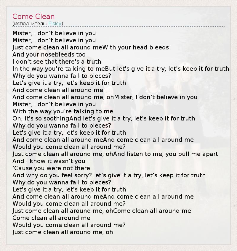 Mister, I don't believe in you Mister, I don't believe in you Just come clean all around meWith your head bleeds And your nosebleeds too I don't see that there's a truth In the way you're talking to meBut let's give it a try, let's keep it for truth Why do you wanna fall to pieces? Let's give it a try, let's keep it for truth And come clean all around me And come clean all around me, ohMister, I don't believe in you Mister, I don't believe in you With the way you're talking to me Oh, it's so soothingAnd let's give it a try, let's keep it for truth Why do you wanna fall to pieces? Let's give it a try, let's keep it for truth And come clean all around meAnd come clean all around me Would you come clean all around me? Just come clean all around me, ohAnd listen to me, you pull me apart And I know it wasn't you 'Cause you were not there And why do you feel sorry?Let's give it a try, let's keep it for truth Why do you wanna fall to pieces? Let's give it a try, let's keep it for truth And come clean all around meAnd come clean all around me Would you come clean all around me? Just come clean all around me, ohCome clean all around me Come clean all around me Would you come clean all around me? Just come clean all around me, oh