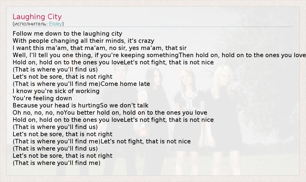 Follow me down to the laughing city With people changing all their minds, it's crazy I want this ma'am, that ma'am, no sir, yes ma'am, that sir Well, I'll tell you one thing, if you're keeping somethingThen hold on, hold on to the ones you love Hold on, hold on to the ones you loveLet's not fight, that is not nice (That is where you'll find us) Let's not be sore, that is not right (That is where you'll find me)Come home late I know you're sick of working You're feeling down Because your head is hurtingSo we don't talk Oh no, no, no, noYou better hold on, hold on to the ones you love Hold on, hold on to the ones you loveLet's not fight, that is not nice (That is where you'll find us) Let's not be sore, that is not right (That is where you'll find me)Let's not fight, that is not nice (That is where you'll find us) Let's not be sore, that is not right (That is where you'll find me)