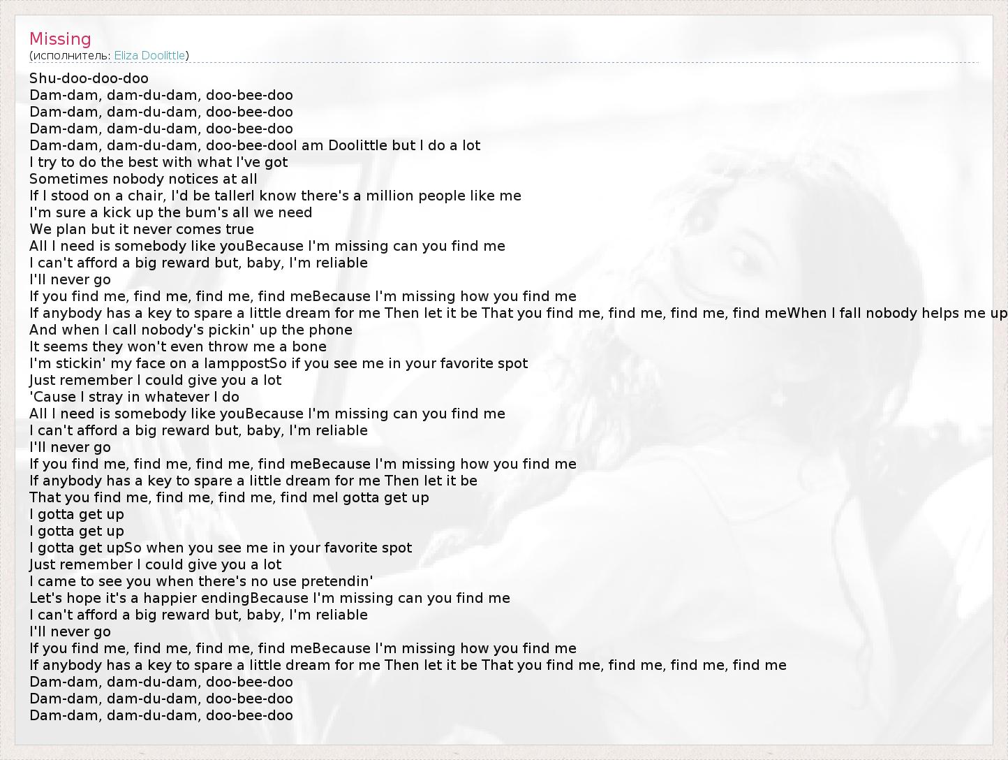 Shu-doo-doo-doo Dam-dam, dam-du-dam, doo-bee-doo Dam-dam, dam-du-dam, doo-bee-doo Dam-dam, dam-du-dam, doo-bee-doo Dam-dam, dam-du-dam, doo-bee-dooI am Doolittle but I do a lot I try to do the best with what I've got Sometimes nobody notices at all If I stood on a chair, I'd be tallerI know there's a million people like me I'm sure a kick up the bum's all we need We plan but it never comes true All I need is somebody like youBecause I'm missing can you find me I can't afford a big reward but, baby, I'm reliable I'll never go If you find me, find me, find me, find meBecause I'm missing how you find me If anybody has a key to spare a little dream for me Then let it be That you find me, find me, find me, find meWhen I fall nobody helps me up And when I call nobody's pickin' up the phone It seems they won't even throw me a bone I'm stickin' my face on a lamppostSo if you see me in your favorite spot Just remember I could give you a lot 'Cause I stray in whatever I do All I need is somebody like youBecause I'm missing can you find me I can't afford a big reward but, baby, I'm reliable I'll never go If you find me, find me, find me, find meBecause I'm missing how you find me If anybody has a key to spare a little dream for me Then let it be That you find me, find me, find me, find meI gotta get up I gotta get up I gotta get up I gotta get upSo when you see me in your favorite spot Just remember I could give you a lot I came to see you when there's no use pretendin' Let's hope it's a happier endingBecause I'm missing can you find me I can't afford a big reward but, baby, I'm reliable I'll never go If you find me, find me, find me, find meBecause I'm missing how you find me If anybody has a key to spare a little dream for me Then let it be That you find me, find me, find me, find me Dam-dam, dam-du-dam, doo-bee-doo Dam-dam, dam-du-dam, doo-bee-doo Dam-dam, dam-du-dam, doo-bee-doo