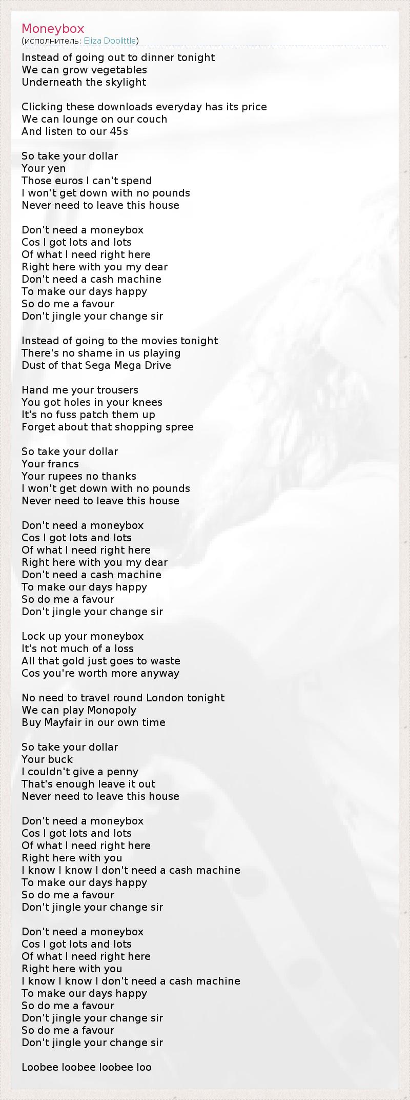 Instead of going out to dinner tonight We can grow vegetables Underneath the skylight Clicking these downloads everyday has its price We can lounge on our couch And listen to our 45s So take your dollar Your yen Those euros I can't spend I won't get down with no pounds Never need to leave this house Don't need a moneybox Cos I got lots and lots Of what I need right here Right here with you my dear Don't need a cash machine To make our days happy So do me a favour Don't jingle your change sir Instead of going to the movies tonight There's no shame in us playing Dust of that Sega Mega Drive Hand me your trousers You got holes in your knees It's no fuss patch them up Forget about that shopping spree So take your dollar Your francs Your rupees no thanks I won't get down with no pounds Never need to leave this house Don't need a moneybox Cos I got lots and lots Of what I need right here Right here with you my dear Don't need a cash machine To make our days happy So do me a favour Don't jingle your change sir Lock up your moneybox It's not much of a loss All that gold just goes to waste Cos you're worth more anyway No need to travel round London tonight We can play Monopoly Buy Mayfair in our own time So take your dollar Your buck I couldn't give a penny That's enough leave it out Never need to leave this house Don't need a moneybox Cos I got lots and lots Of what I need right here Right here with you I know I know I don't need a cash machine To make our days happy So do me a favour Don't jingle your change sir Don't need a moneybox Cos I got lots and lots Of what I need right here Right here with you I know I know I don't need a cash machine To make our days happy So do me a favour Don't jingle your change sir So do me a favour Don't jingle your change sir Loobee loobee loobee loo