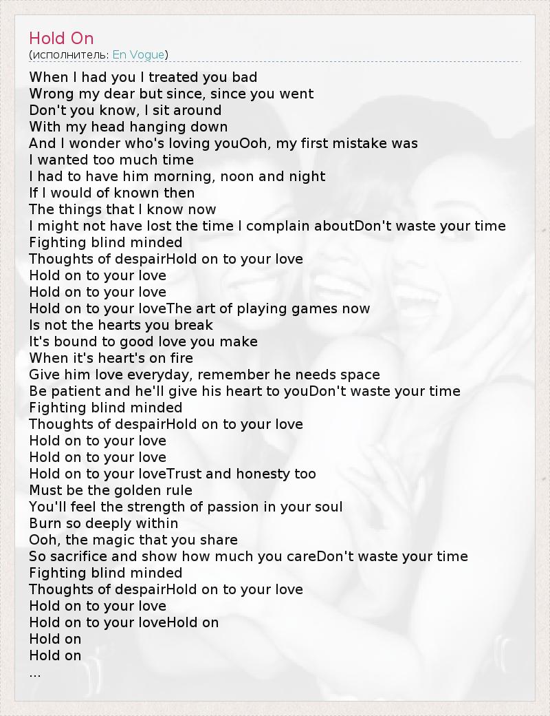 When I had you I treated you bad Wrong my dear but since, since you went Don't you know, I sit around With my head hanging down And I wonder who's loving youOoh, my first mistake was I wanted too much time I had to have him morning, noon and night If I would of known then The things that I know now I might not have lost the time I complain aboutDon't waste your time Fighting blind minded Thoughts of despairHold on to your love Hold on to your love Hold on to your love Hold on to your loveThe art of playing games now Is not the hearts you break It's bound to good love you make When it's heart's on fire Give him love everyday, remember he needs space Be patient and he'll give his heart to youDon't waste your time Fighting blind minded Thoughts of despairHold on to your love Hold on to your love Hold on to your love Hold on to your loveTrust and honesty too Must be the golden rule You'll feel the strength of passion in your soul Burn so deeply within Ooh, the magic that you share So sacrifice and show how much you careDon't waste your time Fighting blind minded Thoughts of despairHold on to your love Hold on to your love Hold on to your loveHold on Hold on Hold on ...