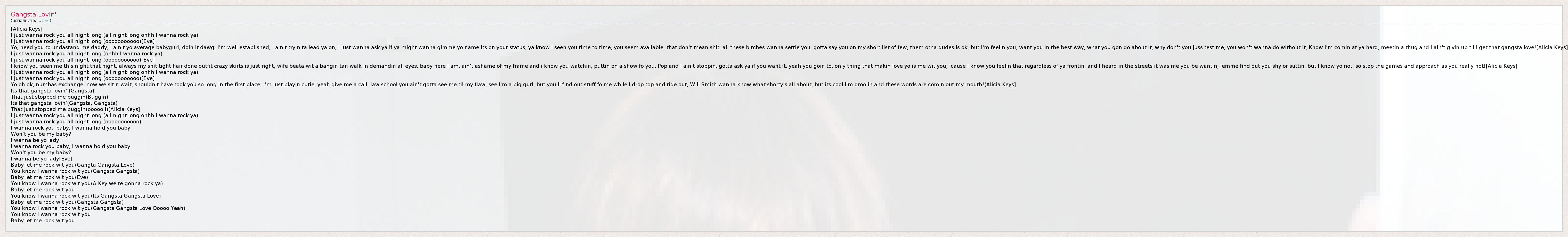 Yo, need you to undastand me daddy, I ain't yo average babygurl, doin it dawg, I'm well established, I ain't tryin ta lead ya on, I just wanna ask ya if ya might wanna gimme yo name its on your status, ya know i seen you time to time, you seem available, that don't mean shit, all these bitches wanna settle you, gotta say you on my short list of few, them otha dudes is ok, but I'm feelin you, want you in the best way, what you gon do about it, why don't you juss test me, you won't wanna do without it, Know I'm comin at ya hard, meetin a thug and I ain't givin up til I get that gangsta love![Alicia Keys]