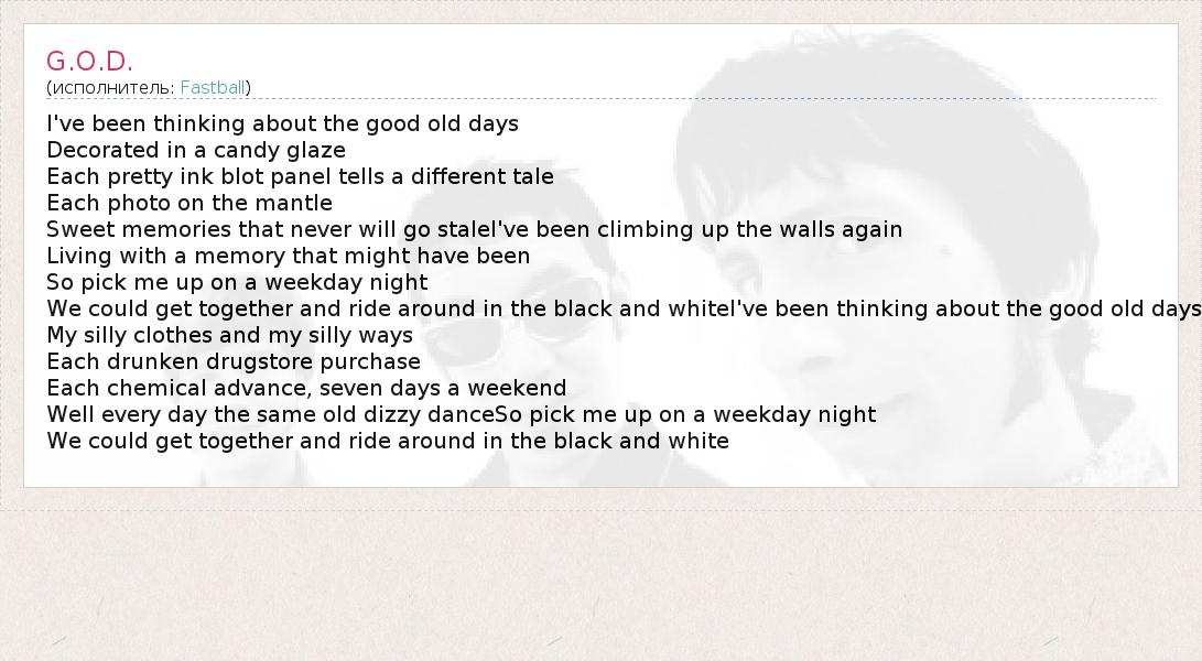 I've been thinking about the good old days Decorated in a candy glaze Each pretty ink blot panel tells a different tale Each photo on the mantle Sweet memories that never will go staleI've been climbing up the walls again Living with a memory that might have been So pick me up on a weekday night We could get together and ride around in the black and whiteI've been thinking about the good old days My silly clothes and my silly ways Each drunken drugstore purchase Each chemical advance, seven days a weekend Well every day the same old dizzy danceSo pick me up on a weekday night We could get together and ride around in the black and white