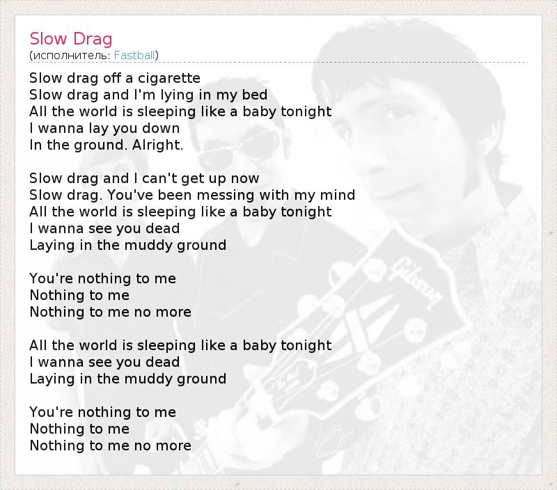 Slow drag off a cigarette Slow drag and I'm lying in my bed All the world is sleeping like a baby tonight I wanna lay you down In the ground. Alright. Slow drag and I can't get up now Slow drag. You've been messing with my mind All the world is sleeping like a baby tonight I wanna see you dead Laying in the muddy ground You're nothing to me Nothing to me Nothing to me no more All the world is sleeping like a baby tonight I wanna see you dead Laying in the muddy ground You're nothing to me Nothing to me Nothing to me no more