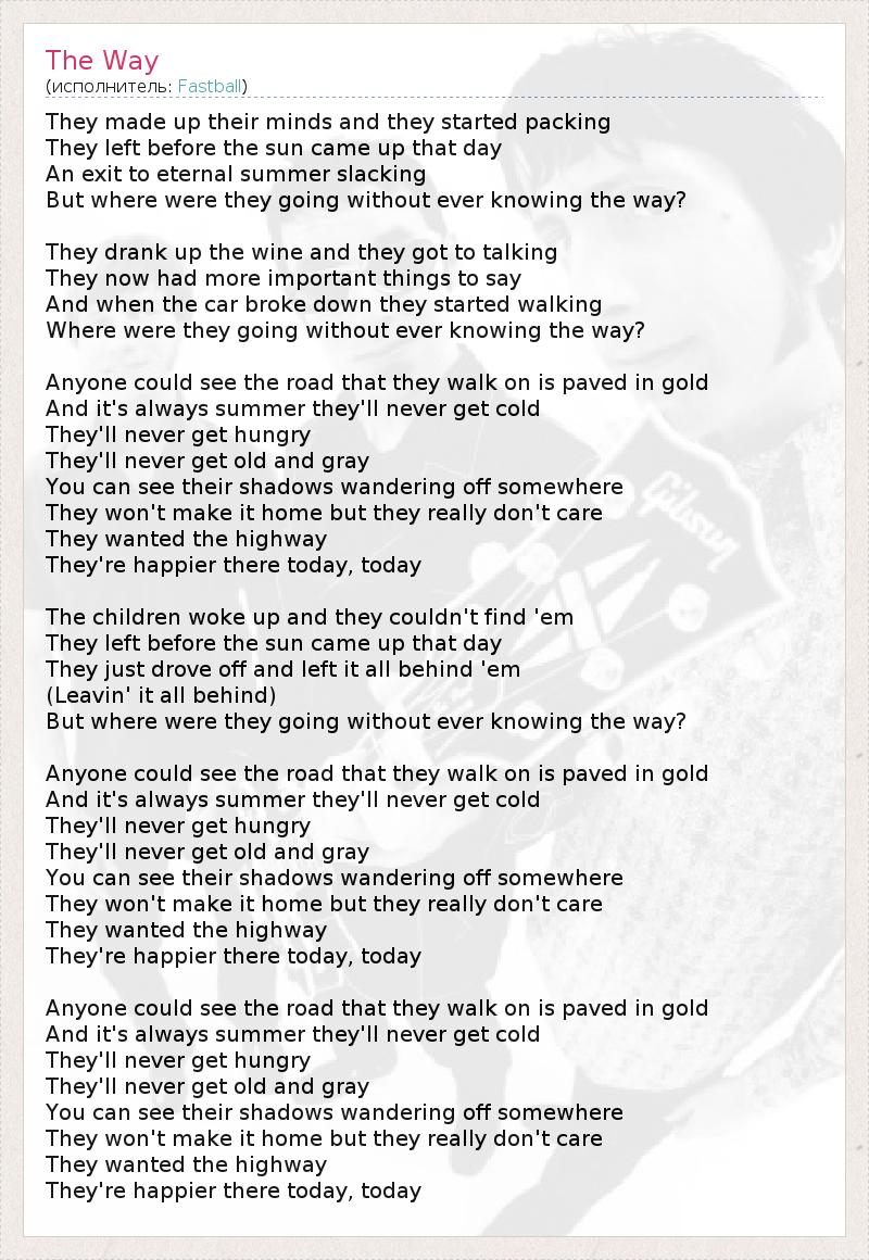 Они собрались с духом и начали паковать вещи. Они ушли до того, как взошло солнце в тот день. Уход от вечной летней апатии, Но куда же они отправились, даже не зная пути? Они напились вина, и пришло время поговорить, Теперь им было, что сказать друг другу. А когда машина сломалась, они пошли пешком. Куда же они отправились, даже не зная пути? Любой бы заметил, что дорога, по которой они идут, вымощена золотом, Лето вечно, они никогда не замерзнут, Никогда не проголодаются, Никогда не постареют и не поседеют. Можешь увидеть, как их тени сбиваются с курса, Они не обоснуются там, но им все равно, Им нужно было лишь шоссе, Они стали счастливее там сегодня. Дети проснулись, и не смогли их найти: Они ушли до того, как взошло солнце в тот день. Они просто уехали и оставили все позади, (Оставляя все позади), Но куда же они отправились, даже не зная пути? Любой бы заметил, что дорога, по которой они идут, вымощена золотом, Лето вечно, они никогда не замерзнут, Никогда не проголодаются, Никогда не постареют и не поседеют. Можешь увидеть, как их тени сбиваются с курса, Они не обоснуются там, но им все равно, Им нужно было лишь шоссе, Они стали счастливее там сегодня. Любой бы заметил, что дорога, по которой они идут, вымощена золотом, Лето вечно, они никогда не замерзнут, Никогда не проголодаются, Никогда не постареют и не поседеют. Можешь увидеть, как их тени сбиваются с курса, Они не обоснуются там, но им все равно, Им нужно было лишь шоссе, Они стали счастливее там сегодня.