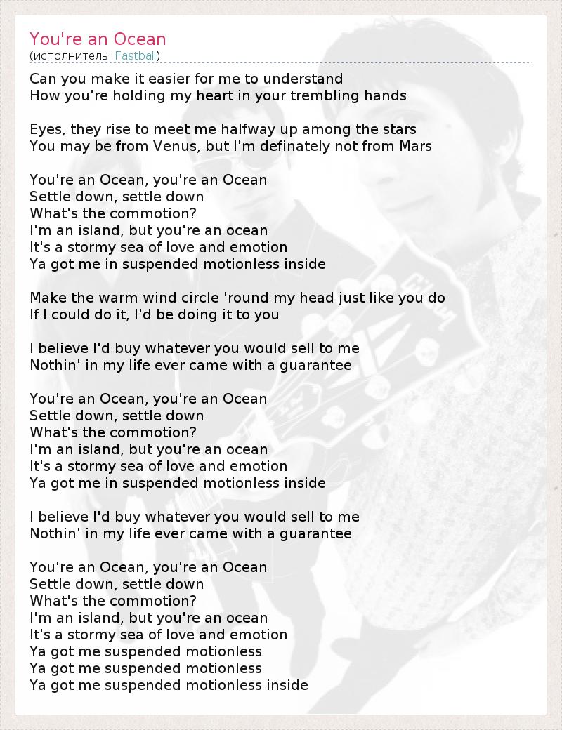 Я никак не могу понять, Как у тебя получается держать моё сердце в своих дрожащих руках. Поднимаешь глаза, чтобы увидеть меня на пол-пути к звёздам. Может быть, ты и из Венеры, но я точно не с Марса. Ты океан, ты океан, Тише, тише, Что за волнение? Я остров, а ты океан - Это бурное море любви и эмоций. Ты захватила меня изнутри. Заставь тёплый ветер окружить меня так же, как это делаешь ты. Если бы я мог, я бы делал это с тобой. Я уверен, что купил бы всё, что ты бы продала мне, Мне не нужны гарантии, их никогда не было в моей жизни. Ты океан, ты океан, Тише, тише, Что за волнение? Я остров, а ты океан - Это бурное море любви и эмоций. Ты захватила меня изнутри. Я уверен, что купил бы всё, что ты бы продала мне, Мне не нужны гарантии, их никогда не было в моей жизни. Ты океан, ты океан, Тише, тише, Что за волнение? Я остров, а ты океан - Это бурное море любви и эмоций. Ты захватила меня, Ты захватила меня, Ты захватила меня изнутри.