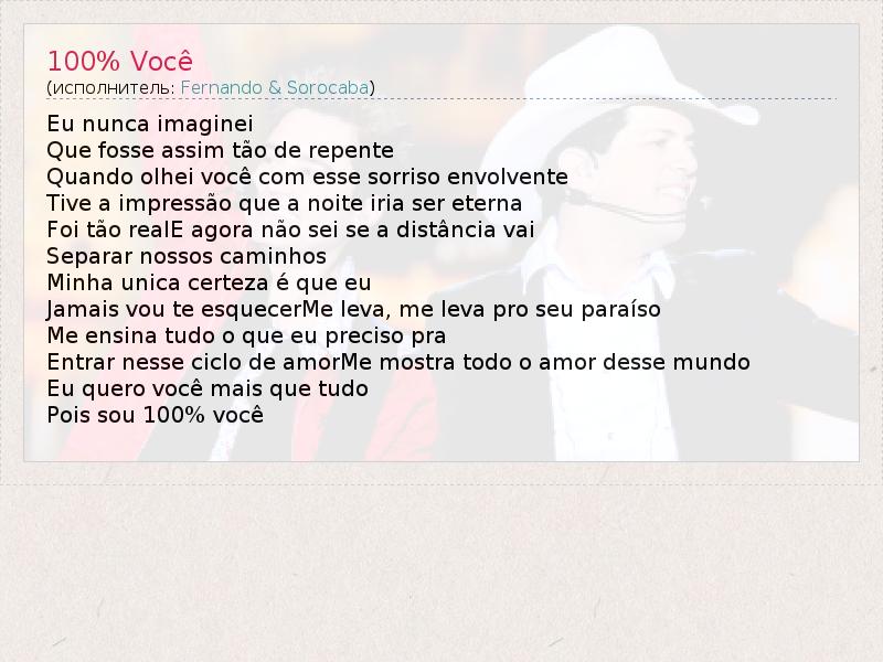 А как ты думаешь, о чем песня "100% Você" ?