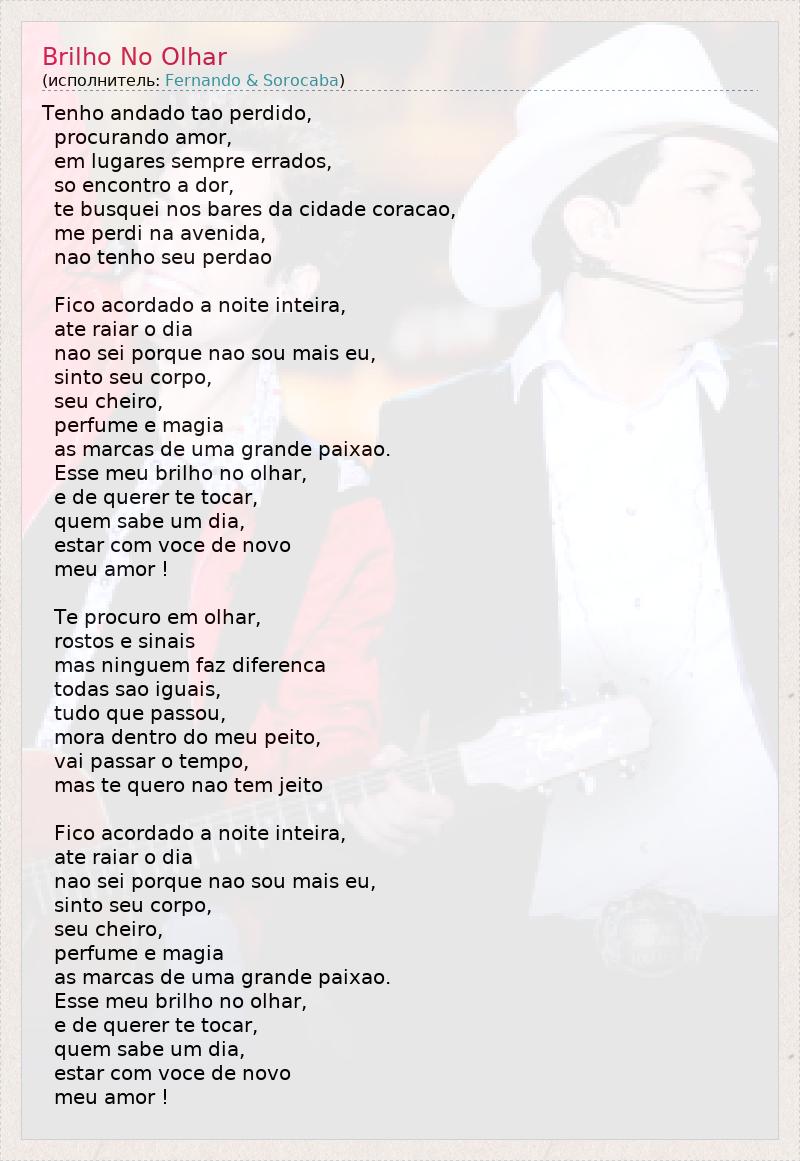 Tenho andado tao perdido, procurando amor, em lugares sempre errados, so encontro a dor, te busquei nos bares da cidade coracao, me perdi na avenida, nao tenho seu perdao Fico acordado a noite inteira, ate raiar o dia nao sei porque nao sou mais eu, sinto seu corpo, seu cheiro, perfume e magia as marcas de uma grande paixao. Esse meu brilho no olhar, e de querer te tocar, quem sabe um dia, estar com voce de novo meu amor ! Te procuro em olhar, rostos e sinais mas ninguem faz diferenca todas sao iguais, tudo que passou, mora dentro do meu peito, vai passar o tempo, mas te quero nao tem jeito Fico acordado a noite inteira, ate raiar o dia nao sei porque nao sou mais eu, sinto seu corpo, seu cheiro, perfume e magia as marcas de uma grande paixao. Esse meu brilho no olhar, e de querer te tocar, quem sabe um dia, estar com voce de novo meu amor !