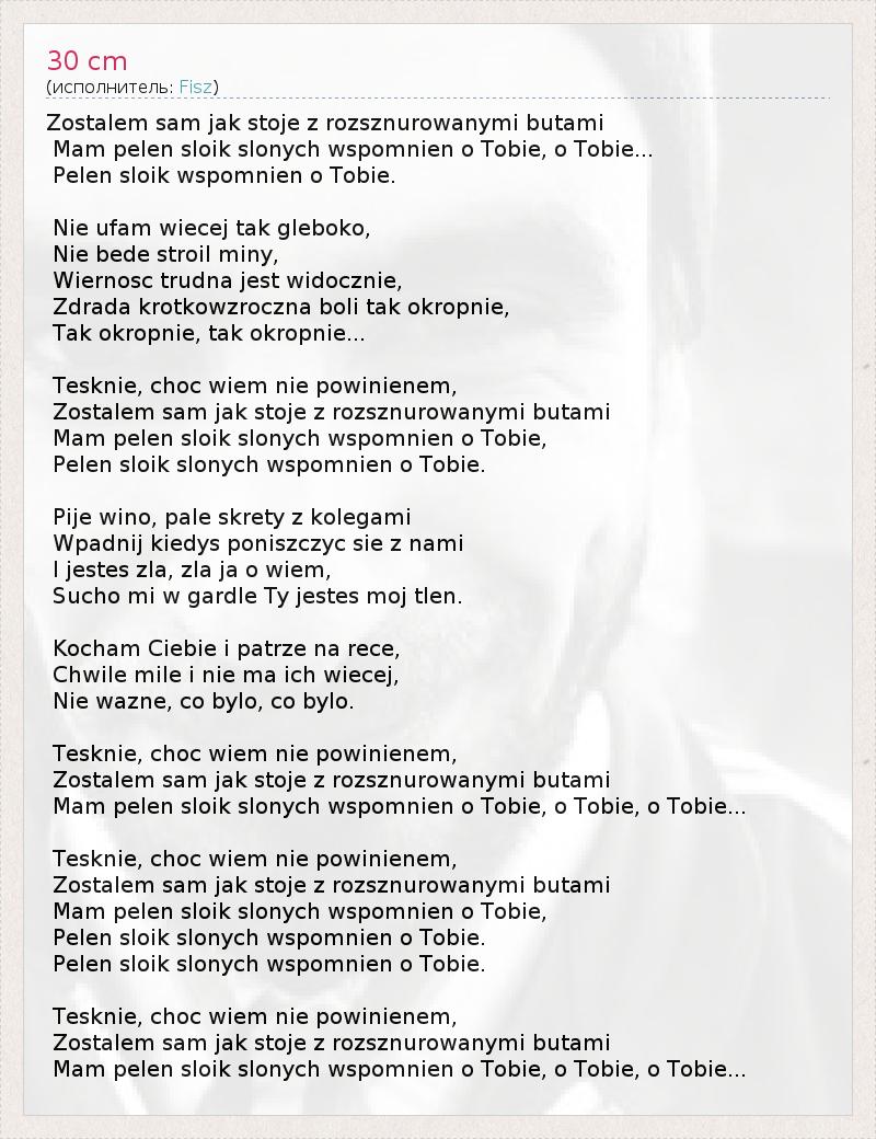 Zostalem sam jak stoje z rozsznurowanymi butami Mam pelen sloik slonych wspomnien o Tobie, o Tobie... Pelen sloik wspomnien o Tobie. Nie ufam wiecej tak gleboko, Nie bede stroil miny, Wiernosc trudna jest widocznie, Zdrada krotkowzroczna boli tak okropnie, Tak okropnie, tak okropnie... Tesknie, choc wiem nie powinienem, Zostalem sam jak stoje z rozsznurowanymi butami Mam pelen sloik slonych wspomnien o Tobie, Pelen sloik slonych wspomnien o Tobie. Pije wino, pale skrety z kolegami Wpadnij kiedys poniszczyc sie z nami I jestes zla, zla ja o wiem, Sucho mi w gardle Ty jestes moj tlen. Kocham Ciebie i patrze na rece, Chwile mile i nie ma ich wiecej, Nie wazne, co bylo, co bylo. Tesknie, choc wiem nie powinienem, Zostalem sam jak stoje z rozsznurowanymi butami Mam pelen sloik slonych wspomnien o Tobie, o Tobie, o Tobie... Tesknie, choc wiem nie powinienem, Zostalem sam jak stoje z rozsznurowanymi butami Mam pelen sloik slonych wspomnien o Tobie, Pelen sloik slonych wspomnien o Tobie. Pelen sloik slonych wspomnien o Tobie. Tesknie, choc wiem nie powinienem, Zostalem sam jak stoje z rozsznurowanymi butami Mam pelen sloik slonych wspomnien o Tobie, o Tobie, o Tobie...