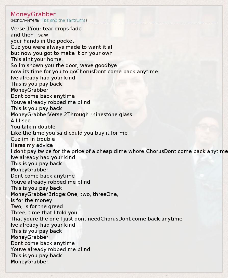 Verse 1Your tear drops fade and then I saw your hands in the pocket. Cuz you were always made to want it all but now you got to make it on your own This aint your home. So Im shown you the door, wave goodbye now its time for you to goChorusDont come back anytime Ive already had your kind This is you pay back MoneyGrabber Dont come back anytime Youve already robbed me blind This is you pay back MoneyGrabberVerse 2Through rhinestone glass All I see You talkin double Like the time you said could you buy it for me Cuz im in trouble Heres my advice I dont pay twice for the price of a cheap dime whore!ChorusDont come back anytime Ive already had your kind This is you pay back MoneyGrabber Dont come back anytime Youve already robbed me blind This is you pay back MoneyGrabberBridge:One, two, threeOne, Is for the money Two, is for the greed Three, time that I told you That youre the one I just dont needChorusDont come back anytime Ive already had your kind This is you pay back MoneyGrabber Dont come back anytime Youve already robbed me blind This is you pay back MoneyGrabber