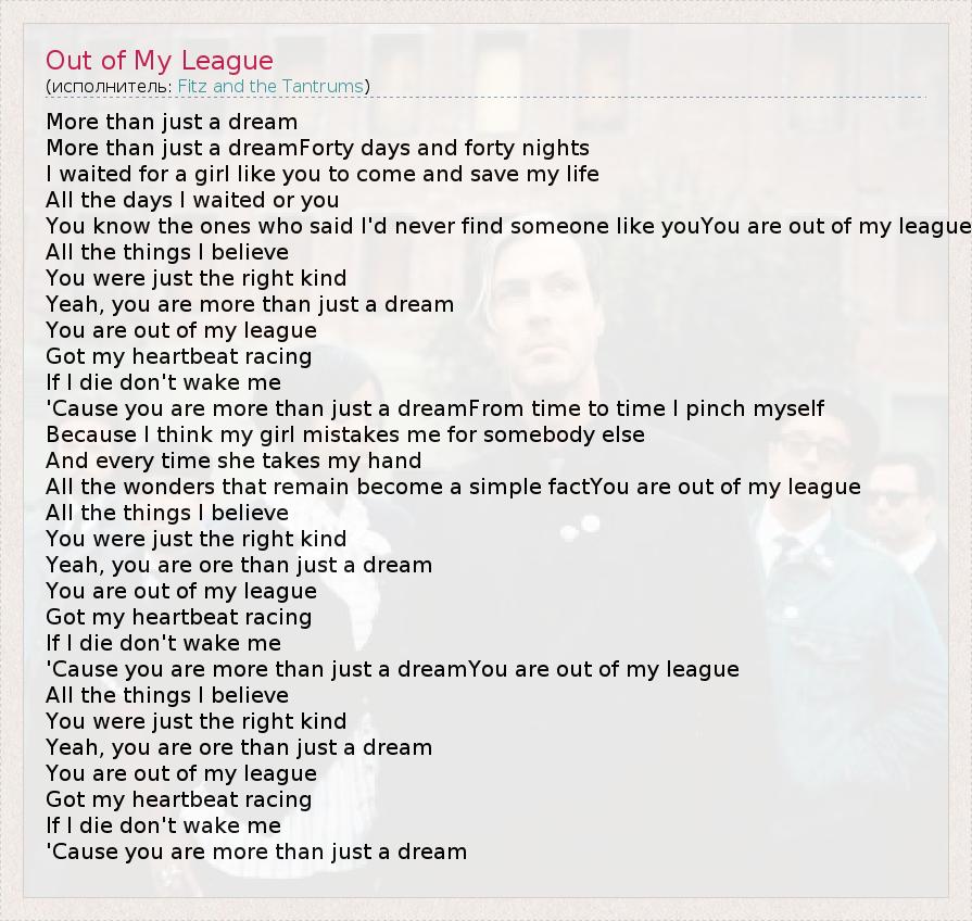More than just a dream More than just a dreamForty days and forty nights I waited for a girl like you to come and save my life All the days I waited or you You know the ones who said I'd never find someone like youYou are out of my league All the things I believe You were just the right kind Yeah, you are more than just a dream You are out of my league Got my heartbeat racing If I die don't wake me 'Cause you are more than just a dreamFrom time to time I pinch myself Because I think my girl mistakes me for somebody else And every time she takes my hand All the wonders that remain become a simple factYou are out of my league All the things I believe You were just the right kind Yeah, you are ore than just a dream You are out of my league Got my heartbeat racing If I die don't wake me 'Cause you are more than just a dreamYou are out of my league All the things I believe You were just the right kind Yeah, you are ore than just a dream You are out of my league Got my heartbeat racing If I die don't wake me 'Cause you are more than just a dream