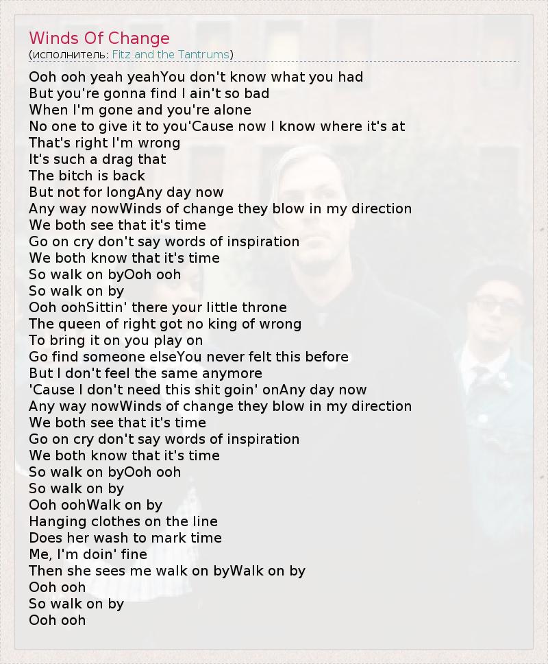 Ooh ooh yeah yeahYou don't know what you had But you're gonna find I ain't so bad When I'm gone and you're alone No one to give it to you'Cause now I know where it's at That's right I'm wrong It's such a drag that The bitch is back But not for longAny day now Any way nowWinds of change they blow in my direction We both see that it's time Go on cry don't say words of inspiration We both know that it's time So walk on byOoh ooh So walk on by Ooh oohSittin' there your little throne The queen of right got no king of wrong To bring it on you play on Go find someone elseYou never felt this before But I don't feel the same anymore 'Cause I don't need this shit goin' onAny day now Any way nowWinds of change they blow in my direction We both see that it's time Go on cry don't say words of inspiration We both know that it's time So walk on byOoh ooh So walk on by Ooh oohWalk on by Hanging clothes on the line Does her wash to mark time Me, I'm doin' fine Then she sees me walk on byWalk on by Ooh ooh So walk on by Ooh ooh