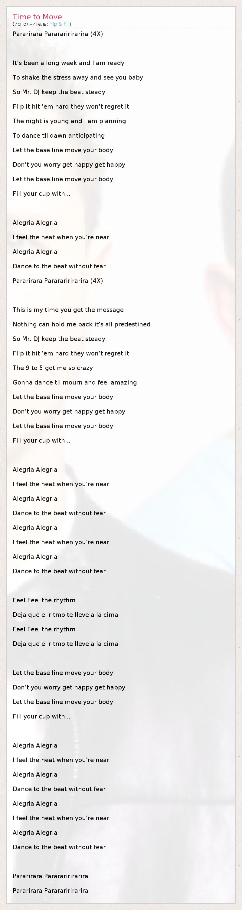 Pararirara Parararirirarira (4X) It's been a long week and I am ready To shake the stress away and see you baby So Mr. DJ keep the beat steady Flip it hit 'em hard they won't regret it The night is young and I am planning To dance til dawn anticipating Let the base line move your body Don't you worry get happy get happy Let the base line move your body Fill your cup with... Alegria Alegria I feel the heat when you're near Alegria Alegria Dance to the beat without fear Pararirara Parararirirarira (4X) This is my time you get the message Nothing can hold me back it's all predestined So Mr. DJ keep the beat steady Flip it hit 'em hard they won't regret it The 9 to 5 got me so crazy Gonna dance til mourn and feel amazing Let the base line move your body Don't you worry get happy get happy Let the base line move your body Fill your cup with... Alegria Alegria I feel the heat when you're near Alegria Alegria Dance to the beat without fear Alegria Alegria I feel the heat when you're near Alegria Alegria Dance to the beat without fear Feel Feel the rhythm Deja que el ritmo te lleve a la cima Feel Feel the rhythm Deja que el ritmo te lleve a la cima Let the base line move your body Don't you worry get happy get happy Let the base line move your body Fill your cup with... Alegria Alegria I feel the heat when you're near Alegria Alegria Dance to the beat without fear Alegria Alegria I feel the heat when you're near Alegria Alegria Dance to the beat without fear Pararirara Parararirirarira Pararirara Parararirirarira