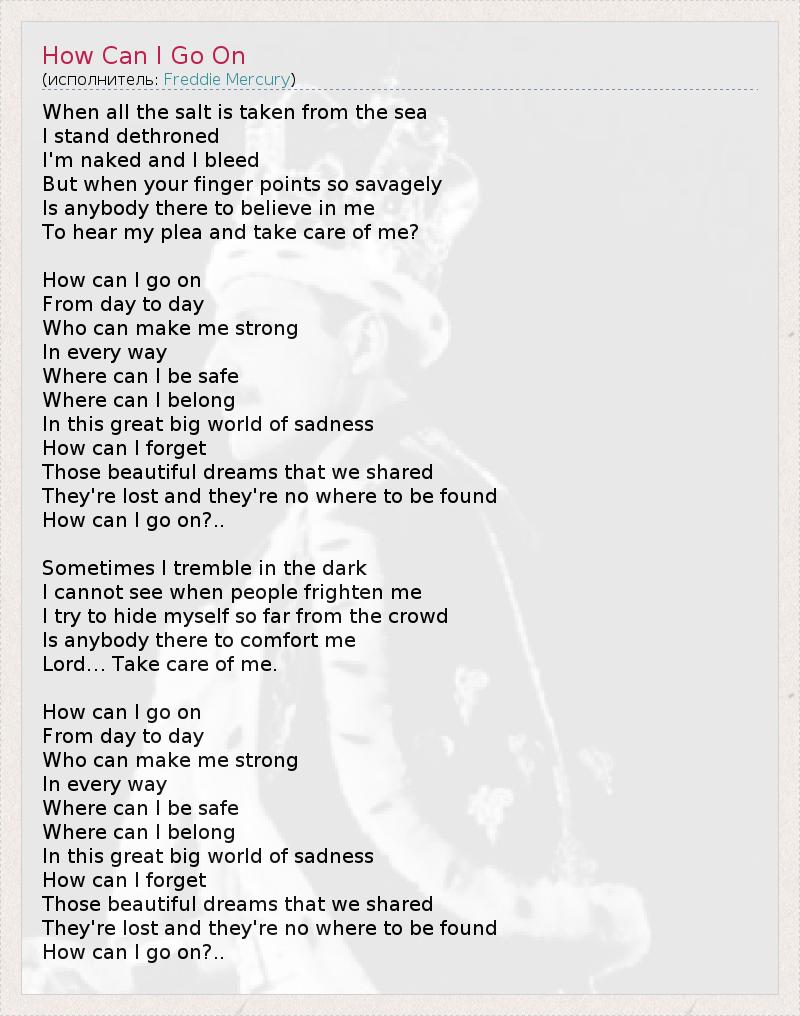 When all the salt is taken from the sea I stand dethroned I'm naked and I bleed But when your finger points so savagely Is anybody there to believe in me To hear my plea and take care of me? How can I go on From day to day Who can make me strong In every way Where can I be safe Where can I belong In this great big world of sadness How can I forget Those beautiful dreams that we shared They're lost and they're no where to be found How can I go on?.. Sometimes I tremble in the dark I cannot see when people frighten me I try to hide myself so far from the crowd Is anybody there to comfort me Lord… Take care of me. How can I go on From day to day Who can make me strong In every way Where can I be safe Where can I belong In this great big world of sadness How can I forget Those beautiful dreams that we shared They're lost and they're no where to be found How can I go on?..