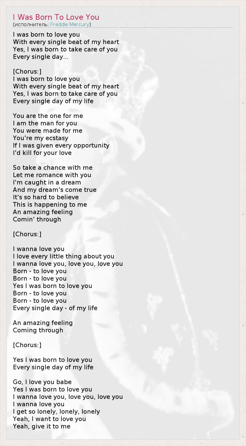 I was born to love you With every single beat of my heart Yes, I was born to take care of you Every single day... [Chorus:] I was born to love you With every single beat of my heart Yes, I was born to take care of you Every single day of my life You are the one for me I am the man for you You were made for me You're my ecstasy If I was given every opportunity I'd kill for your love So take a chance with me Let me romance with you I'm caught in a dream And my dream's come true It's so hard to believe This is happening to me An amazing feeling Comin' through [Chorus:] I wanna love you I love every little thing about you I wanna love you, love you, love you Born - to love you Born - to love you Yes I was born to love you Born - to love you Born - to love you Every single day - of my life An amazing feeling Coming through [Chorus:] Yes I was born to love you Every single day of my life Go, I love you babe Yes I was born to love you I wanna love you, love you, love you I wanna love you I get so lonely, lonely, lonely Yeah, I want to love you Yeah, give it to me