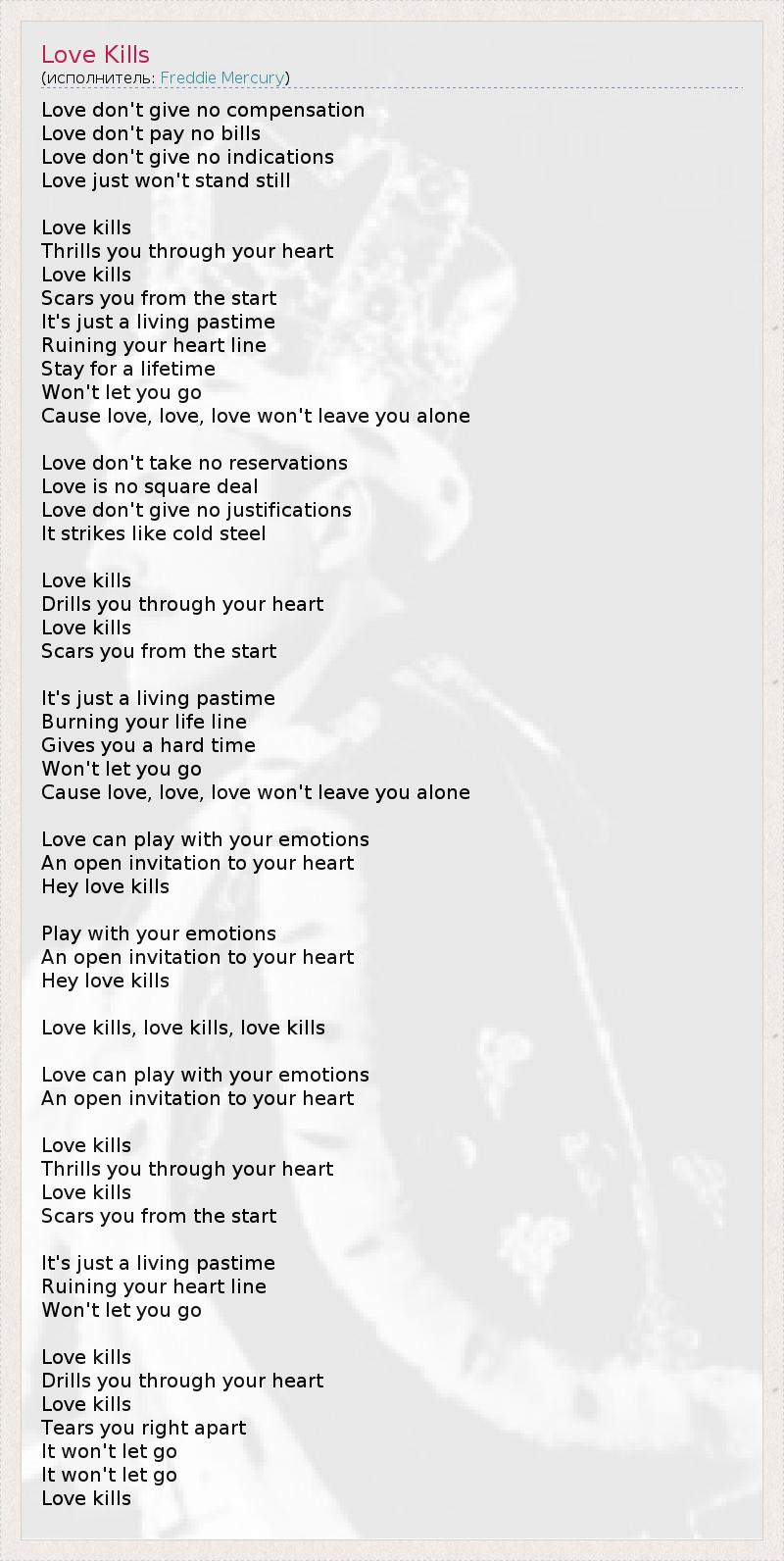 Любовь не предоставляет компенсацию. Любовь не платит по счетам. Любовь не дает указаний. Любовь не будет просто стоять на месте. Любовь убивает, Вызывает дрожь в твоем сердце. Любовь убивает, Оставляет шрамы с самого начала. Это всего лишь жизненное времяпрепровождение, Разрушающее твою линию сердца. Она остается на целую жизнь, Не отпустит тебя, Потому что любовь, любовь, любовь не оставит тебя в покое. Любовь ничего не резервирует. Любовь не относится к честным сделкам. Любовь не предоставляет оправданий. Она бьет, словно холодная сталь. Любовь убивает, Сверлит дыру в твоем сердце. Любовь убивает, Оставляет шрамы с самого начала. Это всего лишь жизненное времяпрепровождение, Сжигающее твою линию жизни. Она усложняет твою жизнь, Не отпустит тебя, Потому что любовь, любовь, любовь не оставит тебя в покое. Любовь может играть с твоими эмоциями, Открытой дверью в твое сердце. Эй, любовь убивает, Играет с твоими эмоциями, Открытой дверью в твое сердце. Эй, любовь убивает. Любовь убивает, любовь убивает, любовь убивает. Любовь может играть с твоими эмоциями, Открытой дверью в твое сердце. Любовь убивает, Вызывает дрожь в твоем сердце. Любовь убивает, Оставляет шрамы с самого начала. Это всего лишь жизненное времяпрепровождение, Разрушающее твою линию сердца. Не отпустит тебя. Любовь убивает, Сверлит дыру в твоем сердце. Любовь убивает, Разрывает тебя на куски. Она не отпустит, Она не отпустит. Любовь убивает.