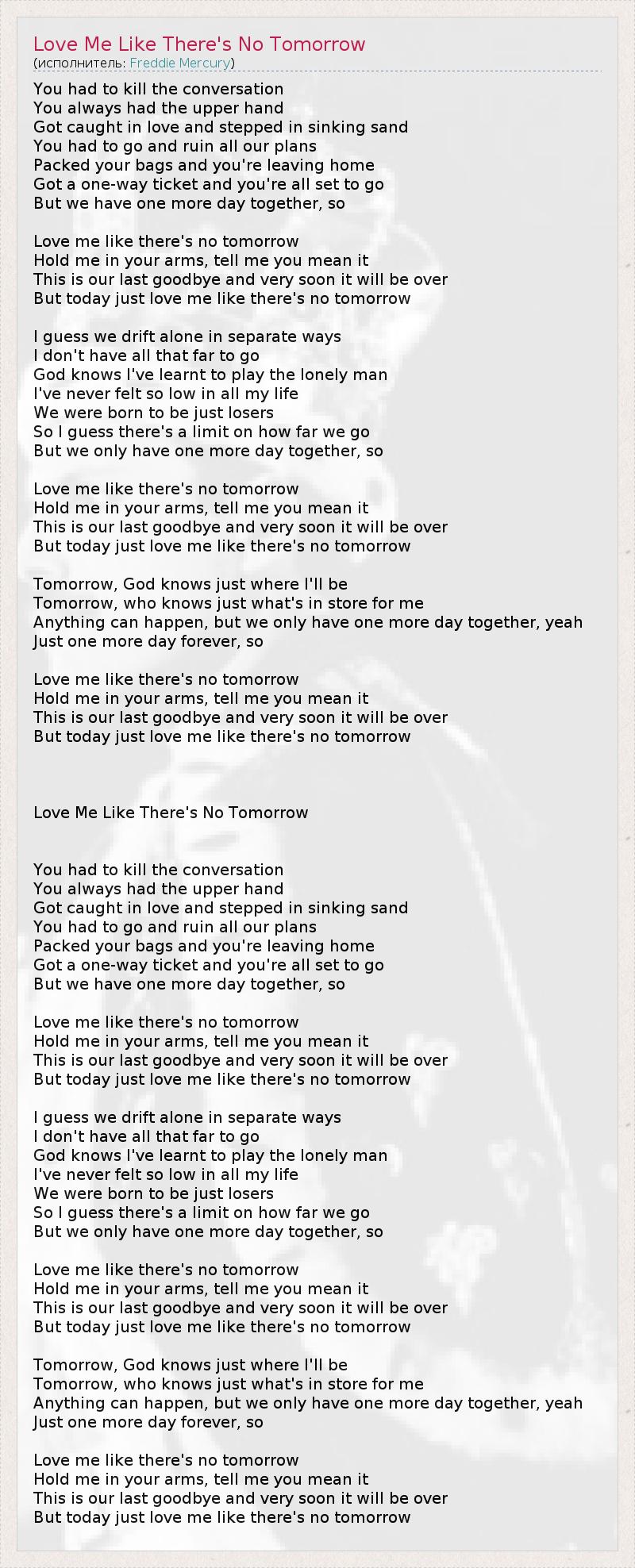 Решила разорвать ты нашу связь, Решение приняв, как прыгнув с кручи. В плену любви, словно в песке зыбучем, Запуталась. Теперь вот рушишь планы. Все вещи собраны - ты покидаешь дом. Билет в один конец, осознаю с трудом. Но день один у нас остался, и я прошу - Люби меня, как будто завтра не придёт. Сожми в объятиях, скажи, что этого ты хочешь. Так мы простимся с этой светлой ночью. Но вот сейчас люби меня, как будто завтра не придёт. Я думаю, что вместе нам не быть. Куда-то приведёт меня дорога... Как жить мне одному, спрошу у Бога. Я так подавлен и мне очень грустно. Ну почему нам в жизни вечно не везёт. Мне кажется, не надо ждать того, что не придёт. Но день один у нас остался, и я прошу - Люби меня, как будто завтра не придёт. Сожми в объятиях, скажи, что этого ты хочешь. Так мы простимся с этой светлой ночью. Но вот сейчас люби меня, как будто завтра не придёт. А завтра - знает только Бог, где буду я... А завтра - кто же знает, что там ждёт меня... Но что-то будет, а пока что день один у нас остался, Лишь день один остался навсегда, и я прошу - Люби меня, как будто завтра не придёт. Сожми в объятиях, скажи, что этого ты хочешь. Так мы простимся с этой светлой ночью. Но вот сейчас люби меня, как будто завтра не придёт. *поэтический перевод Люби меня так, как будто завтра никогда не наступит(перевод Анастасия из Москвы) Ты должна была закончить отношения, Ты всегда была хозяйкой положения, Поймала меня в сети любви, и я оказался среди зыбучих песков, Ты должна была уйти и разрушить все наши планы, Ты собрала багаж и покидаешь дом, Ты взяла билет в один конец и уже готова отправиться в путь, Но у нас есть еще один день вместе, так что Люби меня так, как будто завтра никогда не наступит, Заключи меня в свои объятья, скажи, что это серьезно, Это наше последнее прощание, и очень скоро все будет кончено, Но сегодня люби меня так, как будто завтра никогда не наступит. Я полагаю, мы расходимся в разных направлениях, Но я не могу уйти далеко, Господь знает, я научился играть роль одинокого мужчины, Я никогда в своей жизни не чувствовал себя столь подавленно, Мы рождены быть неудачниками, Так что я думаю, есть предел тому, насколько далеко мы можем зайти, Но у нас еще есть один день вместе, так что Люби меня так, как будто завтра никогда не наступит Заключи меня в свои объятья, скажи, что это серьезно, Это наше последнее прощание, и очень скоро все будет кончено, Но сегодня люби меня так, как будто завтра никогда не наступит. Завтра лишь Господь знает, где я буду, Завтра - кто знает, что будет ожидать меня, Может случиться что угодно, но у нас есть только один день вместе, да Лишь еще один день навсегда, так что Люби меня так, как будто завтра никогда не наступит Заключи меня в свои объятья, скажи, что это серьезно, Это наше последнее прощание, и очень скоро все будет кончено, Но сегодня люби меня так, как будто завтра никогда не наступит.