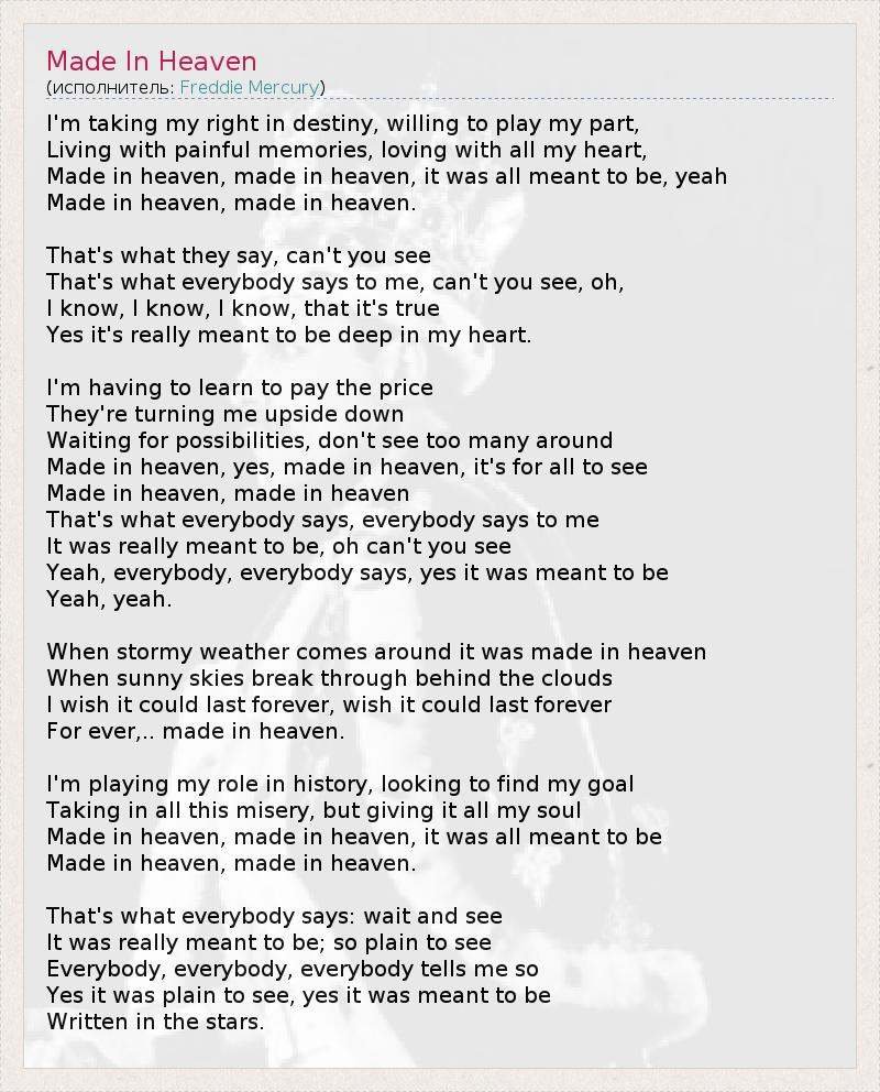 I'm taking my right in destiny, willing to play my part, Living with painful memories, loving with all my heart, Made in heaven, made in heaven, it was all meant to be, yeah Made in heaven, made in heaven. That's what they say, can't you see That's what everybody says to me, can't you see, oh, I know, I know, I know, that it's true Yes it's really meant to be deep in my heart. I'm having to learn to pay the price They're turning me upside down Waiting for possibilities, don't see too many around Made in heaven, yes, made in heaven, it's for all to see Made in heaven, made in heaven That's what everybody says, everybody says to me It was really meant to be, oh can't you see Yeah, everybody, everybody says, yes it was meant to be Yeah, yeah. When stormy weather comes around it was made in heaven When sunny skies break through behind the clouds I wish it could last forever, wish it could last forever For ever,.. made in heaven. I'm playing my role in history, looking to find my goal Taking in all this misery, but giving it all my soul Made in heaven, made in heaven, it was all meant to be Made in heaven, made in heaven. That's what everybody says: wait and see It was really meant to be; so plain to see Everybody, everybody, everybody tells me so Yes it was plain to see, yes it was meant to be Written in the stars.