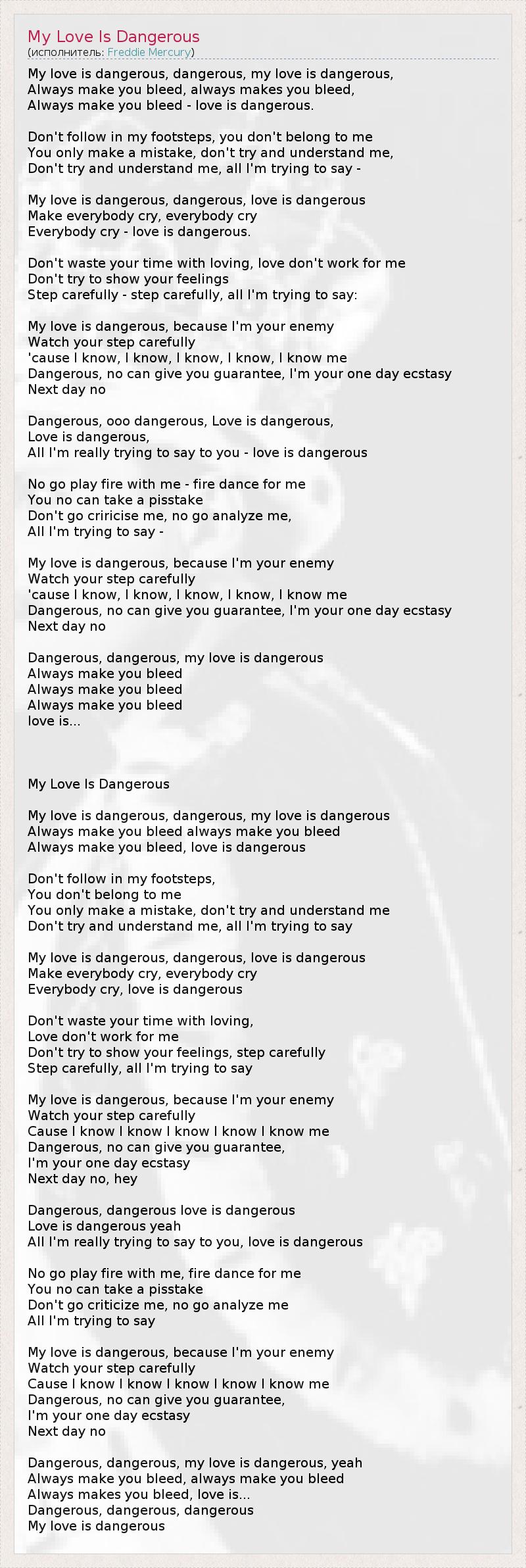 My love is dangerous, dangerous, my love is dangerous, Always make you bleed, always makes you bleed, Always make you bleed - love is dangerous. Don't follow in my footsteps, you don't belong to me You only make a mistake, don't try and understand me, Don't try and understand me, all I'm trying to say - My love is dangerous, dangerous, love is dangerous Make everybody cry, everybody cry Everybody cry - love is dangerous. Don't waste your time with loving, love don't work for me Don't try to show your feelings Step carefully - step carefully, all I'm trying to say: My love is dangerous, because I'm your enemy Watch your step carefully 'cause I know, I know, I know, I know, I know me Dangerous, no can give you guarantee, I'm your one day ecstasy Next day no Dangerous, ooo dangerous, Love is dangerous, Love is dangerous, All I'm really trying to say to you - love is dangerous No go play fire with me - fire dance for me You no can take a pisstake Don't go criricise me, no go analyze me, All I'm trying to say - My love is dangerous, because I'm your enemy Watch your step carefully 'cause I know, I know, I know, I know, I know me Dangerous, no can give you guarantee, I'm your one day ecstasy Next day no Dangerous, dangerous, my love is dangerous Always make you bleed Always make you bleed Always make you bleed love is... My Love Is Dangerous My love is dangerous, dangerous, my love is dangerous Always make you bleed always make you bleed Always make you bleed, love is dangerous Don't follow in my footsteps, You don't belong to me You only make a mistake, don't try and understand me Don't try and understand me, all I'm trying to say My love is dangerous, dangerous, love is dangerous Make everybody cry, everybody cry Everybody cry, love is dangerous Don't waste your time with loving, Love don't work for me Don't try to show your feelings, step carefully Step carefully, all I'm trying to say My love is dangerous, because I'm your enemy Watch your step carefully Cause I know I know I know I know I know me Dangerous, no can give you guarantee, I'm your one day ecstasy Next day no, hey Dangerous, dangerous love is dangerous Love is dangerous yeah All I'm really trying to say to you, love is dangerous No go play fire with me, fire dance for me You no can take a pisstake Don't go criticize me, no go analyze me All I'm trying to say My love is dangerous, because I'm your enemy Watch your step carefully Cause I know I know I know I know I know me Dangerous, no can give you guarantee, I'm your one day ecstasy Next day no Dangerous, dangerous, my love is dangerous, yeah Always make you bleed, always make you bleed Always makes you bleed, love is... Dangerous, dangerous, dangerous My love is dangerous
