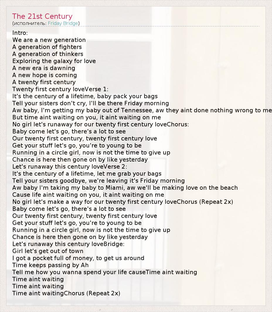 Intro: We are a new generation A generation of fighters A generation of thinkers Exploring the galaxy for love A new era is dawning A new hope is coming A twenty first century Twenty first century loveVerse 1: It's the century of a lifetime, baby pack your bags Tell your sisters don't cry, I'll be there Friday morning Aw baby, I'm getting my baby out of Tennessee, aw they aint done nothing wrong to me But time aint waiting on you, it aint waiting on me No girl let's runaway for our twenty first century loveChorus: Baby come let's go, there's a lot to see Our twenty first century, twenty first century love Get your stuff let's go, you're to young to be Running in a circle girl, now is not the time to give up Chance is here then gone on by like yesterday Let's runaway this century loveVerse 2: It's the century of a lifetime, let me grab your bags Tell your sisters goodbye, we're leaving it's Friday morning Aw baby I'm taking my baby to Miami, aw we'll be making love on the beach Cause life aint waiting on you, it aint waiting on me No girl let's make a way for our twenty first century loveChorus (Repeat 2x) Baby come let's go, there's a lot to see Our twenty first century, twenty first century love Get your stuff let's go, you're to young to be Running in a circle girl, now is not the time to give up Chance is here then gone on by like yesterday Let's runaway this century loveBridge: Girl let's get out of town I got a pocket full of money, to get us around Time keeps passing by Ah Tell me how you wanna spend your life causeTime aint waiting Time aint waiting Time aint waiting Time aint waitingChorus (Repeat 2x)