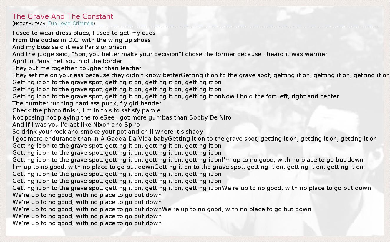 I used to wear dress blues, I used to get my cues From the dudes in D.C. with the wing tip shoes And my boss said it was Paris or prison And the judge said, "Son, you better make your decision"I chose the former because I heard it was warmer April in Paris, hell south of the border They put me together, tougher than leather They set me on your ass because they didn't know betterGetting it on to the grave spot, getting it on, getting it on, getting it on Getting it on to the grave spot, getting it on, getting it on, getting it on Getting it on to the grave spot, getting it on, getting it on, getting it on Getting it on to the grave spot, getting it on, getting it on, getting it onNow I hold the fort left, right and center The number running hard ass punk, fly girl bender Check the photo finish, I'm in this to satisfy parole Not posing not playing the roleSee I got more gumbas than Bobby De Niro And if I was you I'd act like Nixon and Spiro So drink your rock and smoke your pot and chill where it's shady I got more endurance than in-A-Gadda-Da-Vida babyGetting it on to the grave spot, getting it on, getting it on, getting it on Getting it on to the grave spot, getting it on, getting it on, getting it on Getting it on to the grave spot, getting it on, getting it on, getting it on Getting it on to the grave spot, getting it on, getting it on, getting it onI'm up to no good, with no place to go but down I'm up to no good, with no place to go but downGetting it on to the grave spot, getting it on, getting it on, getting it on Getting it on to the grave spot, getting it on, getting it on, getting it on Getting it on to the grave spot, getting it on, getting it on, getting it on Getting it on to the grave spot, getting it on, getting it on, getting it onWe're up to no good, with no place to go but down We're up to no good, with no place to go but down We're up to no good, with no place to go but down We're up to no good, with no place to go but downWe're up to no good, with no place to go but down We're up to no good, with no place to go but down We're up to no good, with no place to go but down