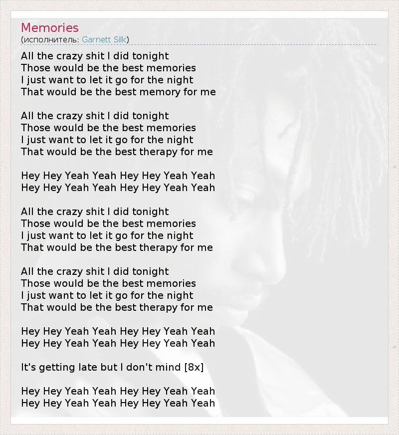 All the crazy shit I did tonight Those would be the best memories I just want to let it go for the night That would be the best memory for me All the crazy shit I did tonight Those would be the best memories I just want to let it go for the night That would be the best therapy for me Hey Hey Yeah Yeah Hey Hey Yeah Yeah Hey Hey Yeah Yeah Hey Hey Yeah Yeah All the crazy shit I did tonight Those would be the best memories I just want to let it go for the night That would be the best therapy for me All the crazy shit I did tonight Those would be the best memories I just want to let it go for the night That would be the best therapy for me Hey Hey Yeah Yeah Hey Hey Yeah Yeah Hey Hey Yeah Yeah Hey Hey Yeah Yeah It's getting late but I don't mind [8x] Hey Hey Yeah Yeah Hey Hey Yeah Yeah Hey Hey Yeah Yeah Hey Hey Yeah Yeah