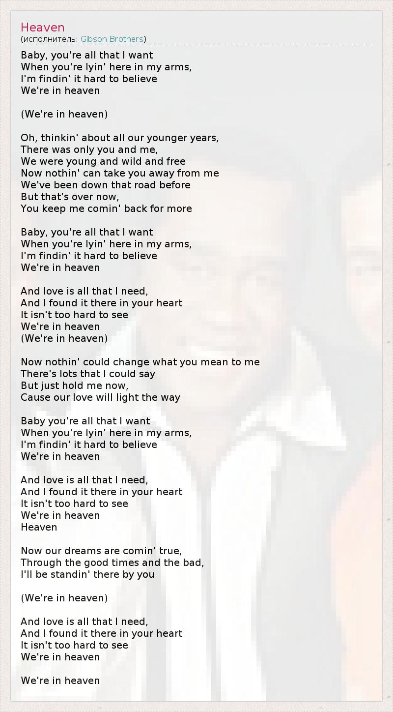 Это интересно:Gibson Brothers - диско-группа, основана во Франции в конце 70-х годов. В составе команды три брата: Chris - (lead vocals, percussion), Patrick (vocals, drums) и Alex (vocals, keyboards). Свой первый сингл - "Come To America" записали в Париже в 1976г. Успех группе принес альбом 78-го года Cuba, который поднялся на высокие строки в чартах Европы. С того времени группа успешно гастролирует. В Советском Союзе были известны по песне "Que Sera... продолжение