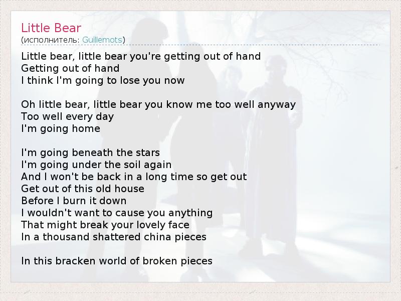 Little bear, little bear you're getting out of hand Getting out of hand I think I'm going to lose you now Oh little bear, little bear you know me too well anyway Too well every day I'm going home I'm going beneath the stars I'm going under the soil again And I won't be back in a long time so get out Get out of this old house Before I burn it down I wouldn't want to cause you anything That might break your lovely face In a thousand shattered china pieces In this bracken world of broken pieces