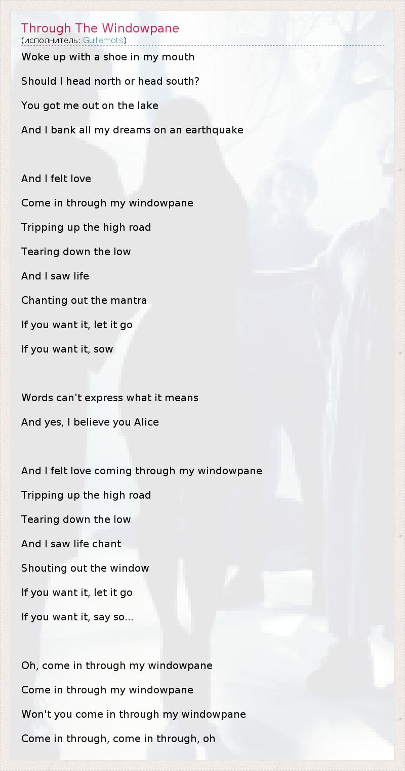 Woke up with a shoe in my mouth Should I head north or head south? You got me out on the lake And I bank all my dreams on an earthquake And I felt love Come in through my windowpane Tripping up the high road Tearing down the low And I saw life Chanting out the mantra If you want it, let it go If you want it, sow Words can't express what it means And yes, I believe you Alice And I felt love coming through my windowpane Tripping up the high road Tearing down the low And I saw life chant Shouting out the window If you want it, let it go If you want it, say so... Oh, come in through my windowpane Come in through my windowpane Won't you come in through my windowpane Come in through, come in through, oh