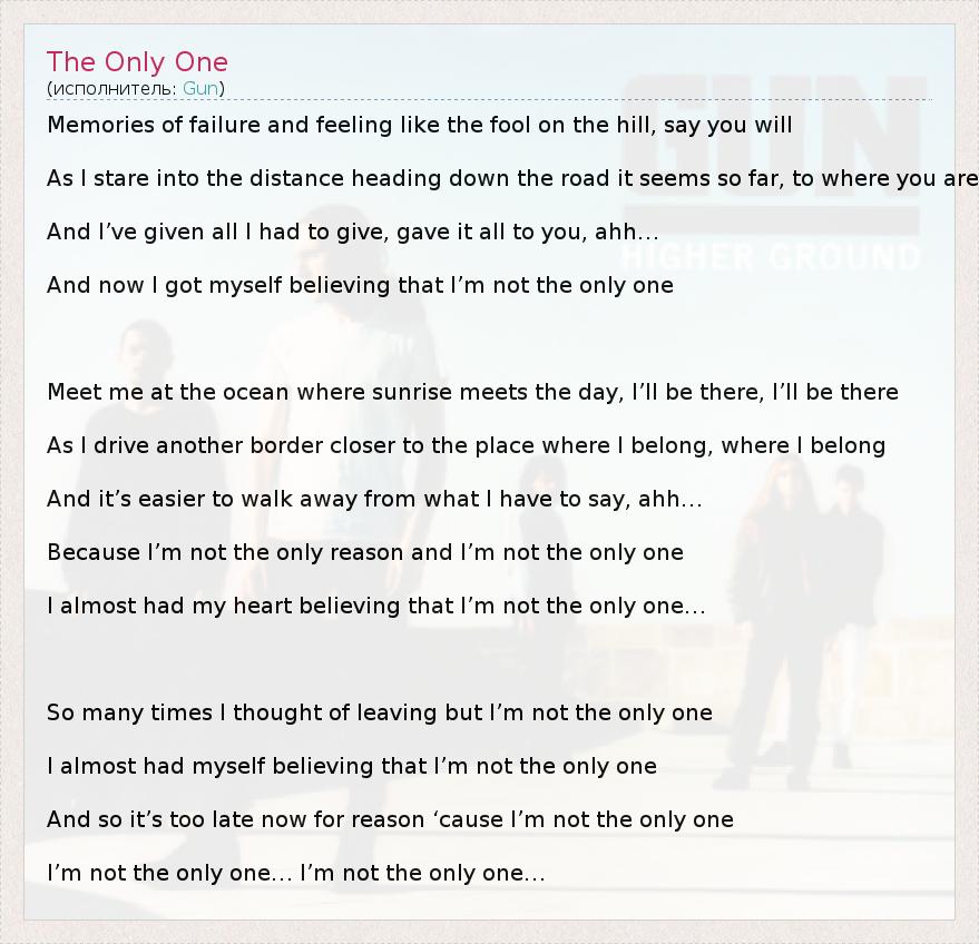Memories of failure and feeling like the fool on the hill, say you will As I stare into the distance heading down the road it seems so far, to where you are And I’ve given all I had to give, gave it all to you, ahh… And now I got myself believing that I’m not the only one Meet me at the ocean where sunrise meets the day, I’ll be there, I’ll be there As I drive another border closer to the place where I belong, where I belong And it’s easier to walk away from what I have to say, ahh… Because I’m not the only reason and I’m not the only one I almost had my heart believing that I’m not the only one… So many times I thought of leaving but I’m not the only one I almost had myself believing that I’m not the only one And so it’s too late now for reason ‘cause I’m not the only one I’m not the only one… I’m not the only one…