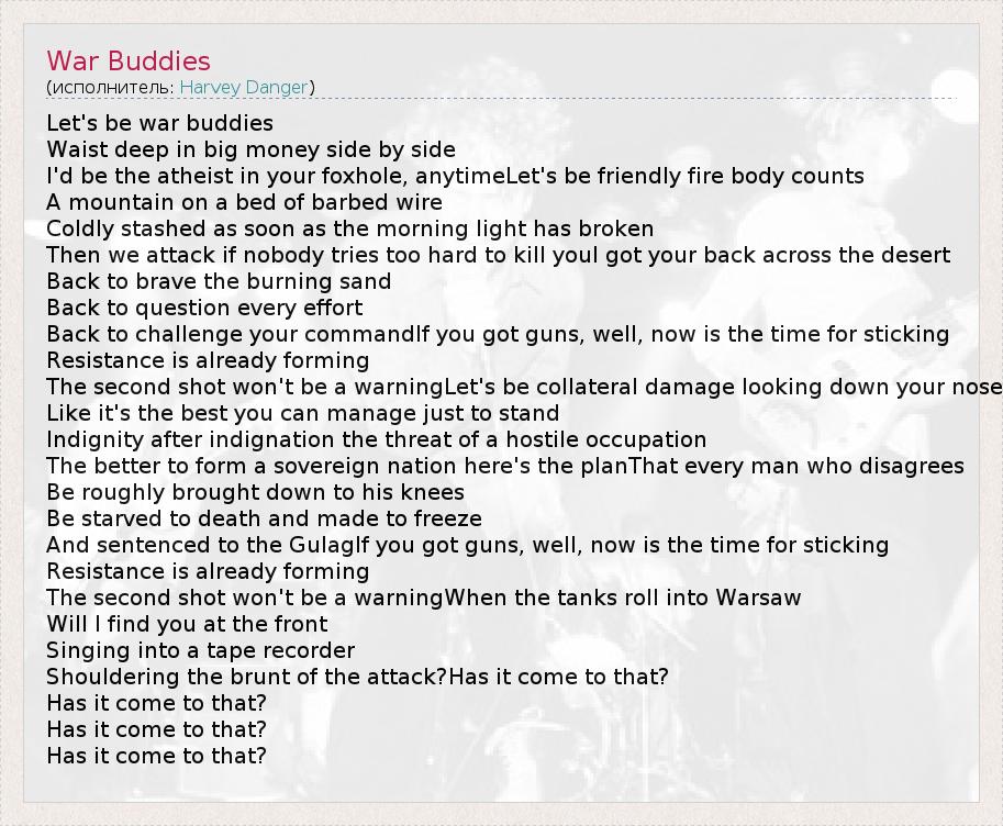 Let's be war buddies Waist deep in big money side by side I'd be the atheist in your foxhole, anytimeLet's be friendly fire body counts A mountain on a bed of barbed wire Coldly stashed as soon as the morning light has broken Then we attack if nobody tries too hard to kill youI got your back across the desert Back to brave the burning sand Back to question every effort Back to challenge your commandIf you got guns, well, now is the time for sticking Resistance is already forming The second shot won't be a warningLet's be collateral damage looking down your nose Like it's the best you can manage just to stand Indignity after indignation the threat of a hostile occupation The better to form a sovereign nation here's the planThat every man who disagrees Be roughly brought down to his knees Be starved to death and made to freeze And sentenced to the GulagIf you got guns, well, now is the time for sticking Resistance is already forming The second shot won't be a warningWhen the tanks roll into Warsaw Will I find you at the front Singing into a tape recorder Shouldering the brunt of the attack?Has it come to that? Has it come to that? Has it come to that? Has it come to that?