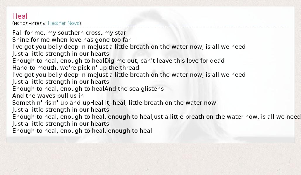 Это интересно:Heather Nova (настоящее имя Heather Allison Frith) родилась на Бермудах 6 июля 1967 года. На скрипке и гитаре Хитер начинает играть рано для своих лет, но первую песню напишет только к 12 годам. После окончания школы в Новой Англии, куда переехала её семья, в 1983 году Хитер поступила в Род-айлендскую школку дизайна (RISD), где она пробует себя в качестве автора сценария к фильмам. Она также посещала занятия по поэзии... продолжение