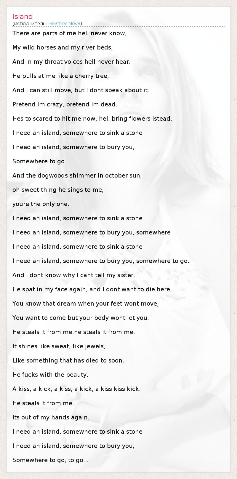 There are parts of me hell never know, My wild horses and my river beds, And in my throat voices hell never hear. He pulls at me like a cherry tree, And I can still move, but I dont speak about it. Pretend Im crazy, pretend Im dead. Hes to scared to hit me now, hell bring flowers istead. I need an island, somewhere to sink a stone I need an island, somewhere to bury you, Somewhere to go. And the dogwoods shimmer in october sun, oh sweet thing he sings to me, youre the only one. I need an island, somewhere to sink a stone I need an island, somewhere to bury you, somewhere I need an island, somewhere to sink a stone I need an island, somewhere to bury you, somewhere to go. And I dont know why I cant tell my sister, He spat in my face again, and I dont want to die here. You know that dream when your feet wont move, You want to come but your body wont let you. He steals it from me.he steals it from me. It shines like sweat, like jewels, Like something that has died to soon. He fucks with the beauty. A kiss, a kick, a kiss, a kick, a kiss kiss kick. He steals it from me. Its out of my hands again. I need an island, somewhere to sink a stone I need an island, somewhere to bury you, Somewhere to go, to go...