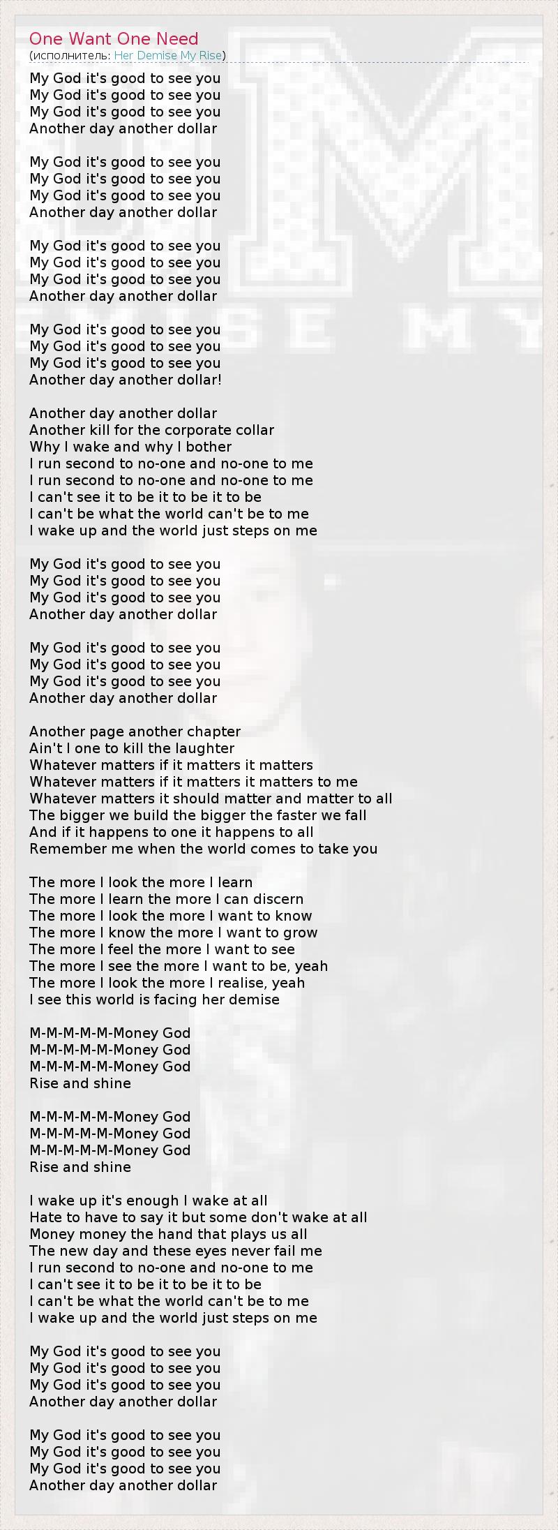 My God it's good to see you My God it's good to see you My God it's good to see you Another day another dollar My God it's good to see you My God it's good to see you My God it's good to see you Another day another dollar My God it's good to see you My God it's good to see you My God it's good to see you Another day another dollar My God it's good to see you My God it's good to see you My God it's good to see you Another day another dollar! Another day another dollar Another kill for the corporate collar Why I wake and why I bother I run second to no-one and no-one to me I run second to no-one and no-one to me I can't see it to be it to be it to be I can't be what the world can't be to me I wake up and the world just steps on me My God it's good to see you My God it's good to see you My God it's good to see you Another day another dollar My God it's good to see you My God it's good to see you My God it's good to see you Another day another dollar Another page another chapter Ain't I one to kill the laughter Whatever matters if it matters it matters Whatever matters if it matters it matters to me Whatever matters it should matter and matter to all The bigger we build the bigger the faster we fall And if it happens to one it happens to all Remember me when the world comes to take you The more I look the more I learn The more I learn the more I can discern The more I look the more I want to know The more I know the more I want to grow The more I feel the more I want to see The more I see the more I want to be, yeah The more I look the more I realise, yeah I see this world is facing her demise M-M-M-M-M-Money God M-M-M-M-M-Money God M-M-M-M-M-Money God Rise and shine M-M-M-M-M-Money God M-M-M-M-M-Money God M-M-M-M-M-Money God Rise and shine I wake up it's enough I wake at all Hate to have to say it but some don't wake at all Money money the hand that plays us all The new day and these eyes never fail me I run second to no-one and no-one to me I can't see it to be it to be it to be I can't be what the world can't be to me I wake up and the world just steps on me My God it's good to see you My God it's good to see you My God it's good to see you Another day another dollar My God it's good to see you My God it's good to see you My God it's good to see you Another day another dollar