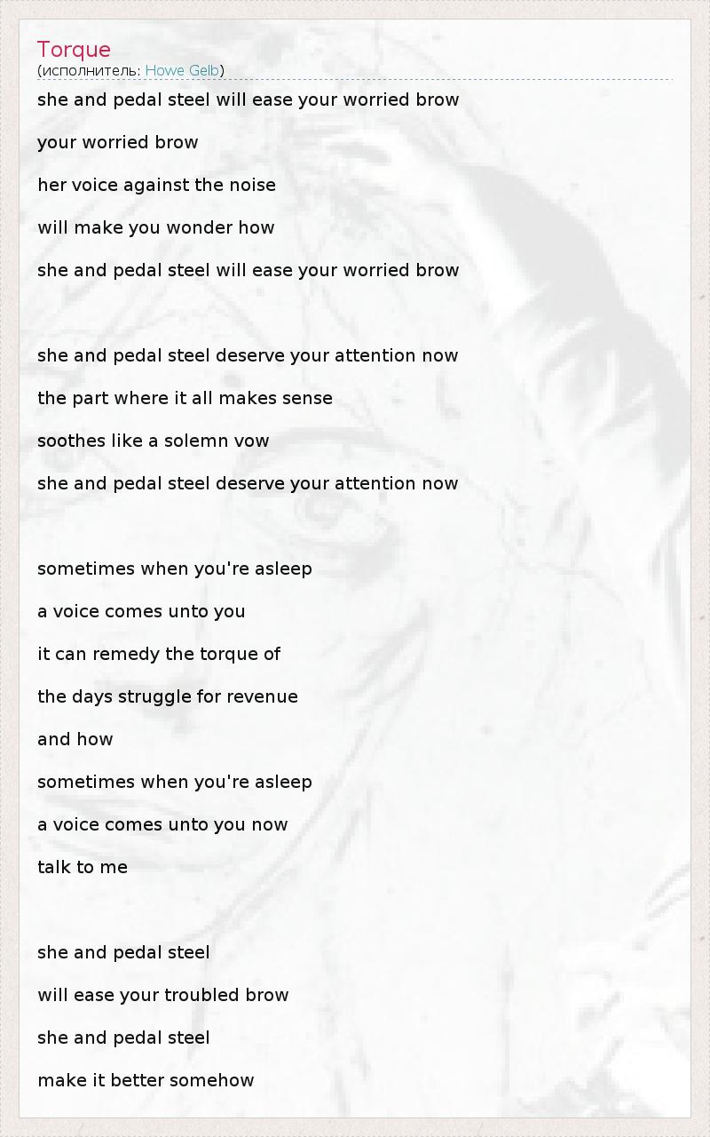 she and pedal steel will ease your worried brow your worried brow her voice against the noise will make you wonder how she and pedal steel will ease your worried brow she and pedal steel deserve your attention now the part where it all makes sense soothes like a solemn vow she and pedal steel deserve your attention now sometimes when you're asleep a voice comes unto you it can remedy the torque of the days struggle for revenue and how sometimes when you're asleep a voice comes unto you now talk to me she and pedal steel will ease your troubled brow she and pedal steel make it better somehow