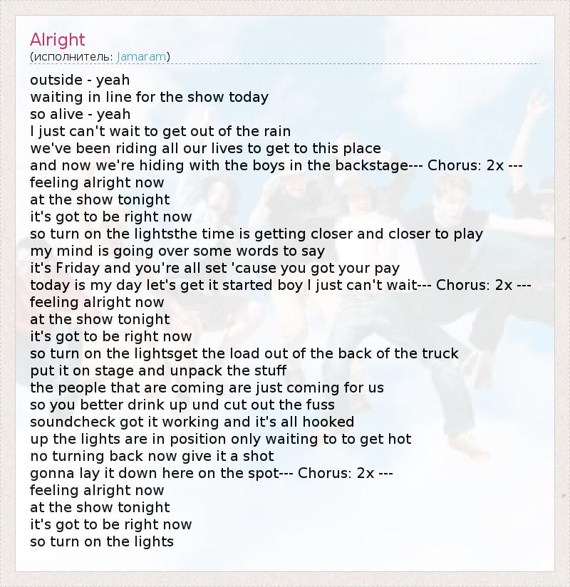 outside - yeah waiting in line for the show today so alive - yeah I just can't wait to get out of the rain we've been riding all our lives to get to this place and now we're hiding with the boys in the backstage--- Chorus: 2x --- feeling alright now at the show tonight it's got to be right now so turn on the lightsthe time is getting closer and closer to play my mind is going over some words to say it's Friday and you're all set 'cause you got your pay today is my day let's get it started boy I just can't wait--- Chorus: 2x --- feeling alright now at the show tonight it's got to be right now so turn on the lightsget the load out of the back of the truck put it on stage and unpack the stuff the people that are coming are just coming for us so you better drink up und cut out the fuss soundcheck got it working and it's all hooked up the lights are in position only waiting to to get hot no turning back now give it a shot gonna lay it down here on the spot--- Chorus: 2x --- feeling alright now at the show tonight it's got to be right now so turn on the lights