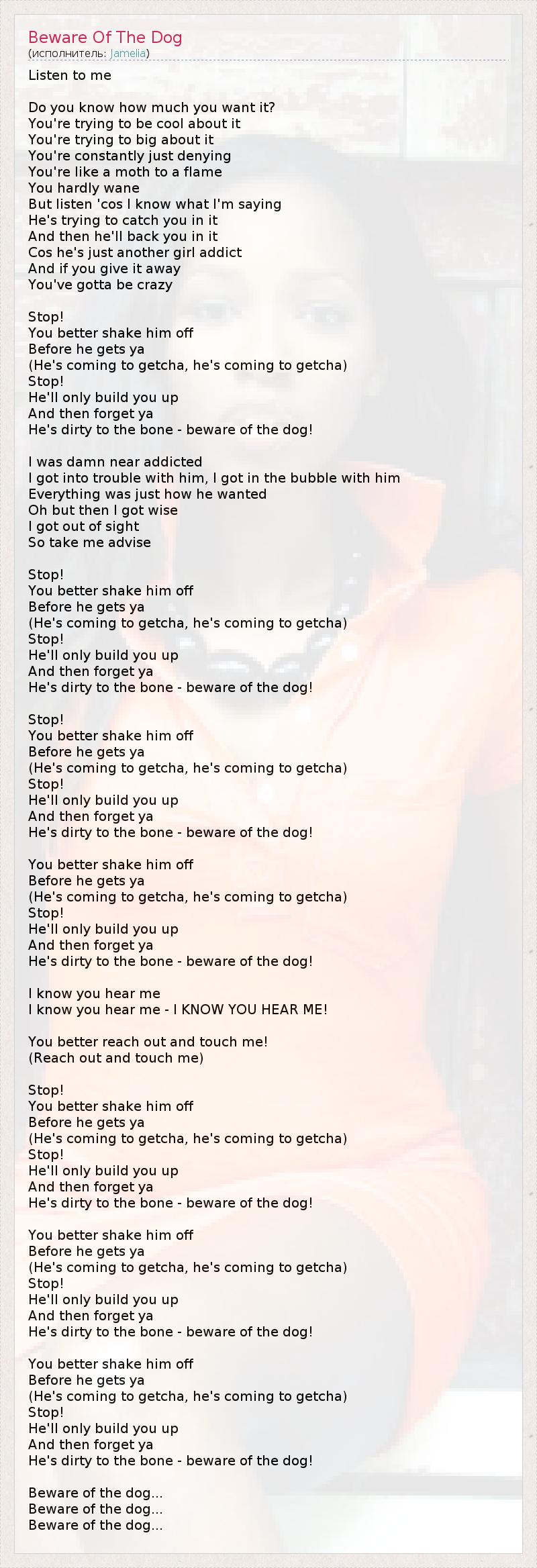 Listen to me Do you know how much you want it? You're trying to be cool about it You're trying to big about it You're constantly just denying You're like a moth to a flame You hardly wane But listen 'cos I know what I'm saying He's trying to catch you in it And then he'll back you in it Cos he's just another girl addict And if you give it away You've gotta be crazy Stop! You better shake him off Before he gets ya (He's coming to getcha, he's coming to getcha) Stop! He'll only build you up And then forget ya He's dirty to the bone - beware of the dog! I was damn near addicted I got into trouble with him, I got in the bubble with him Everything was just how he wanted Oh but then I got wise I got out of sight So take me advise Stop! You better shake him off Before he gets ya (He's coming to getcha, he's coming to getcha) Stop! He'll only build you up And then forget ya He's dirty to the bone - beware of the dog! Stop! You better shake him off Before he gets ya (He's coming to getcha, he's coming to getcha) Stop! He'll only build you up And then forget ya He's dirty to the bone - beware of the dog! You better shake him off Before he gets ya (He's coming to getcha, he's coming to getcha) Stop! He'll only build you up And then forget ya He's dirty to the bone - beware of the dog! I know you hear me I know you hear me - I KNOW YOU HEAR ME! You better reach out and touch me! (Reach out and touch me) Stop! You better shake him off Before he gets ya (He's coming to getcha, he's coming to getcha) Stop! He'll only build you up And then forget ya He's dirty to the bone - beware of the dog! You better shake him off Before he gets ya (He's coming to getcha, he's coming to getcha) Stop! He'll only build you up And then forget ya He's dirty to the bone - beware of the dog! You better shake him off Before he gets ya (He's coming to getcha, he's coming to getcha) Stop! He'll only build you up And then forget ya He's dirty to the bone - beware of the dog! Beware of the dog... Beware of the dog... Beware of the dog...