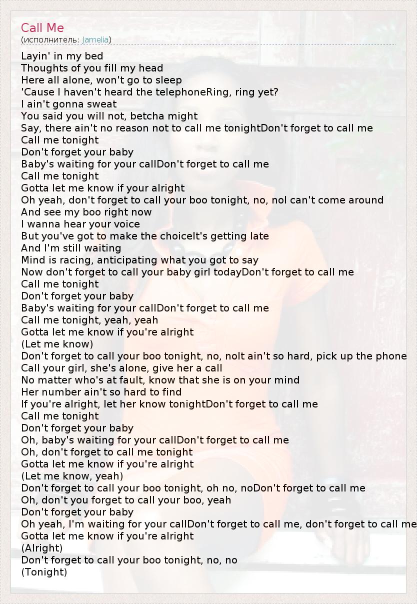 Layin' in my bed Thoughts of you fill my head Here all alone, won't go to sleep 'Cause I haven't heard the telephoneRing, ring yet? I ain't gonna sweat You said you will not, betcha might Say, there ain't no reason not to call me tonightDon't forget to call me Call me tonight Don't forget your baby Baby's waiting for your callDon't forget to call me Call me tonight Gotta let me know if your alright Oh yeah, don't forget to call your boo tonight, no, noI can't come around And see my boo right now I wanna hear your voice But you've got to make the choiceIt's getting late And I'm still waiting Mind is racing, anticipating what you got to say Now don't forget to call your baby girl todayDon't forget to call me Call me tonight Don't forget your baby Baby's waiting for your callDon't forget to call me Call me tonight, yeah, yeah Gotta let me know if you're alright (Let me know) Don't forget to call your boo tonight, no, noIt ain't so hard, pick up the phone Call your girl, she's alone, give her a call No matter who's at fault, know that she is on your mind Her number ain't so hard to find If you're alright, let her know tonightDon't forget to call me Call me tonight Don't forget your baby Oh, baby's waiting for your callDon't forget to call me Oh, don't forget to call me tonight Gotta let me know if you're alright (Let me know, yeah) Don't forget to call your boo tonight, oh no, noDon't forget to call me Oh, don't you forget to call your boo, yeah Don't forget your baby Oh yeah, I'm waiting for your callDon't forget to call me, don't forget to call me Gotta let me know if you're alright (Alright) Don't forget to call your boo tonight, no, no (Tonight)