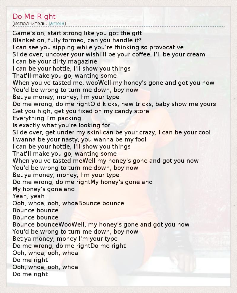 Game's on, start strong like you got the gift Blanket on, fully formed, can you handle it? I can see you sipping while you're thinking so provocative Slide over, uncover your wishI'll be your coffee, I'll be your cream I can be your dirty magazine I can be your hottie, I'll show you things That'll make you go, wanting some When you've tasted me, wooWell my honey's gone and got you now You'd be wrong to turn me down, boy now Bet ya money, money, I'm your type Do me wrong, do me rightOld kicks, new tricks, baby show me yours Get you high, get you fixed on my candy store Everything I'm packing Is exactly what you're looking for Slide over, get under my skinI can be your crazy, I can be your cool I wanna be your nasty, you wanna be my fool I can be your hottie, I'll show you things That'll make you go, wanting some When you've tasted meWell my honey's gone and got you now You'd be wrong to turn me down, boy now Bet ya money, money, I'm your type Do me wrong, do me rightMy honey's gone and My honey's gone and Yeah, yeah Ooh, whoa, ooh, whoaBounce bounce Bounce bounce Bounce bounce Bounce bounceWooWell, my honey's gone and got you now You'd be wrong to turn me down, boy now Bet ya money, money I'm your type Do me wrong, do me rightDo me right Ooh, whoa, ooh, whoa Do me right Ooh, whoa, ooh, whoa Do me right