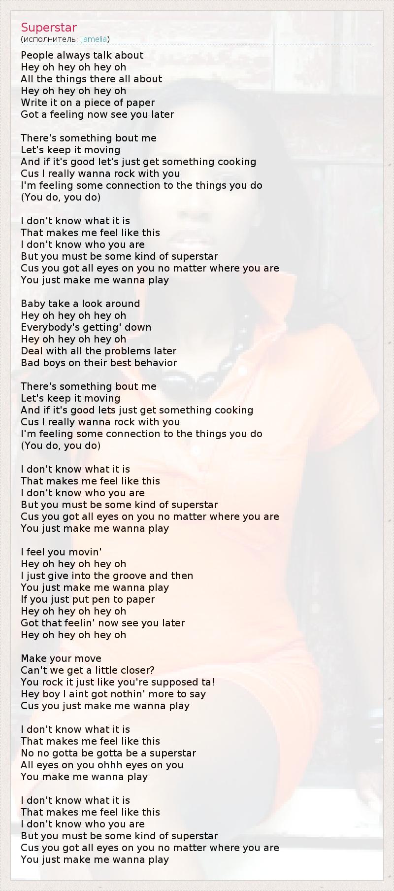 Люди всегда говорят о (Эй, о, эй, о, эй, о!) Обо всем подряд. (Эй, о, эй, о, эй, о!) Напиши это на кусочке бумаги, Мне кажется, что сегодня мы еще увидимся. У меня есть кое-что, Давай двигать телом! И если тебе хорошо, давай перекусим, Потому что я действительно хочу зажигать с тобой. Я чувствую связь с тем, что ты делаешь (Ты делаешь, ты делаешь) Не знаю, что именно Доставляет мне удовольствие. Не знаю, кто ты, Но ты похож на суперзвезду, Потому все смотрят на тебя, где бы ты ни появился. Ты вызываешь во мне желание поиграть. Малыш, осмотрись, (Эй, о, эй, о, эй, о!) Все веселятся! (Эй, о, эй, о, эй, о!) Справимся со всеми проблемами позже, Плохие мальчики ведут себя хорошо. У меня есть кое-что, Давай двигать телом! И если тебе хорошо, давай перекусим, Потому что я действительно хочу зажигать с тобой. Я чувствую связь с тем, что ты делаешь (Ты делаешь, ты делаешь) Не знаю, что именно Доставляет мне удовольствие. Не знаю, кто ты, Но ты похож на суперзвезду, Потому все смотрят на тебя, где бы ты ни появился. Ты вызываешь во мне желание поиграть. Чувствую твои движения, (Эй, о, эй, о, эй, о!) Я погружаюсь в грув, и потом Ты вовлекаешь меня в игру. Если ты просто напишешь это на кусочке бумаги, (Эй, о, эй, о, эй, о!) Мне кажется, что сегодня мы еще увидимся... (Эй, о, эй, о, эй, о!) Двигайся, Можем ли мы встать поближе? Ты зажигаешь как надо! Эй, малыш, у меня нет слов, Потому что ты вовлекаешь меня в игру. Я не знаю, что именно Доставляет мне удовольствие. Нет-нет, должно быть, ты суперзвезда, Все смотрят на тебя, Ты вовлекаешь меня в эту игру. Не знаю, что это, Но это доставляет мне удовольствие. Не знаю, кто ты, Но ты похож на суперзвезду, Потому все смотрят на тебя, где бы ты ни появился. Ты вызываешь во мне желание поиграть.