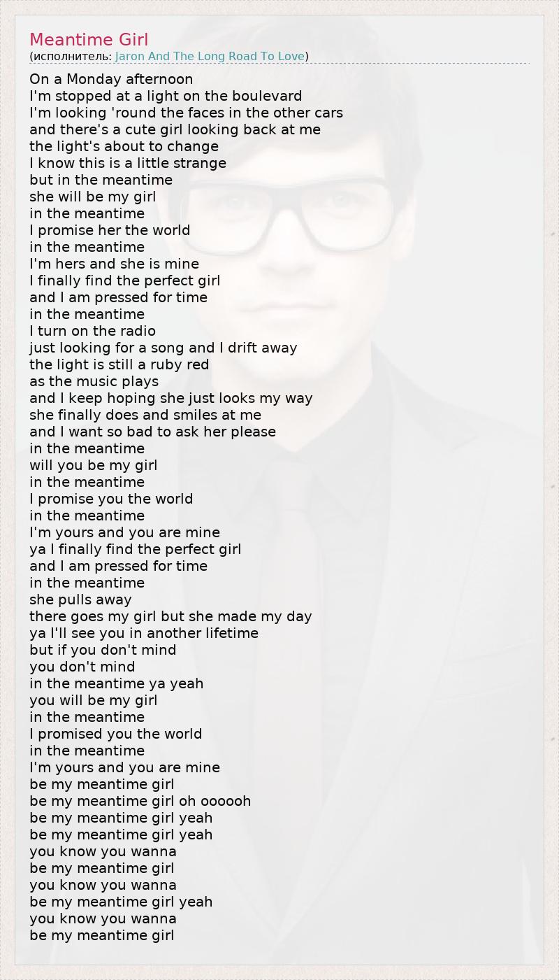 On a Monday afternoon I'm stopped at a light on the boulevard I'm looking 'round the faces in the other cars and there's a cute girl looking back at me the light's about to change I know this is a little strange but in the meantime she will be my girl in the meantime I promise her the world in the meantime I'm hers and she is mine I finally find the perfect girl and I am pressed for time in the meantime I turn on the radio just looking for a song and I drift away the light is still a ruby red as the music plays and I keep hoping she just looks my way she finally does and smiles at me and I want so bad to ask her please in the meantime will you be my girl in the meantime I promise you the world in the meantime I'm yours and you are mine ya I finally find the perfect girl and I am pressed for time in the meantime she pulls away there goes my girl but she made my day ya I'll see you in another lifetime but if you don't mind you don't mind in the meantime ya yeah you will be my girl in the meantime I promised you the world in the meantime I'm yours and you are mine be my meantime girl be my meantime girl oh oooooh be my meantime girl yeah be my meantime girl yeah you know you wanna be my meantime girl you know you wanna be my meantime girl yeah you know you wanna be my meantime girl