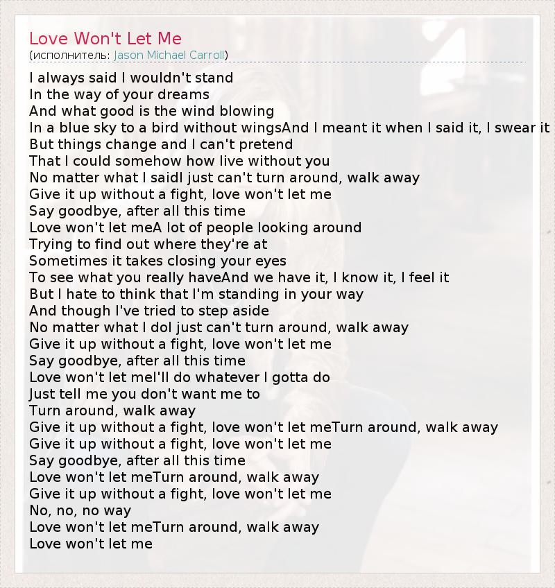 I always said I wouldn't stand In the way of your dreams And what good is the wind blowing In a blue sky to a bird without wingsAnd I meant it when I said it, I swear it But things change and I can't pretend That I could somehow how live without you No matter what I saidI just can't turn around, walk away Give it up without a fight, love won't let me Say goodbye, after all this time Love won't let meA lot of people looking around Trying to find out where they're at Sometimes it takes closing your eyes To see what you really haveAnd we have it, I know it, I feel it But I hate to think that I'm standing in your way And though I've tried to step aside No matter what I doI just can't turn around, walk away Give it up without a fight, love won't let me Say goodbye, after all this time Love won't let meI'll do whatever I gotta do Just tell me you don't want me to Turn around, walk away Give it up without a fight, love won't let meTurn around, walk away Give it up without a fight, love won't let me Say goodbye, after all this time Love won't let meTurn around, walk away Give it up without a fight, love won't let me No, no, no way Love won't let meTurn around, walk away Love won't let me