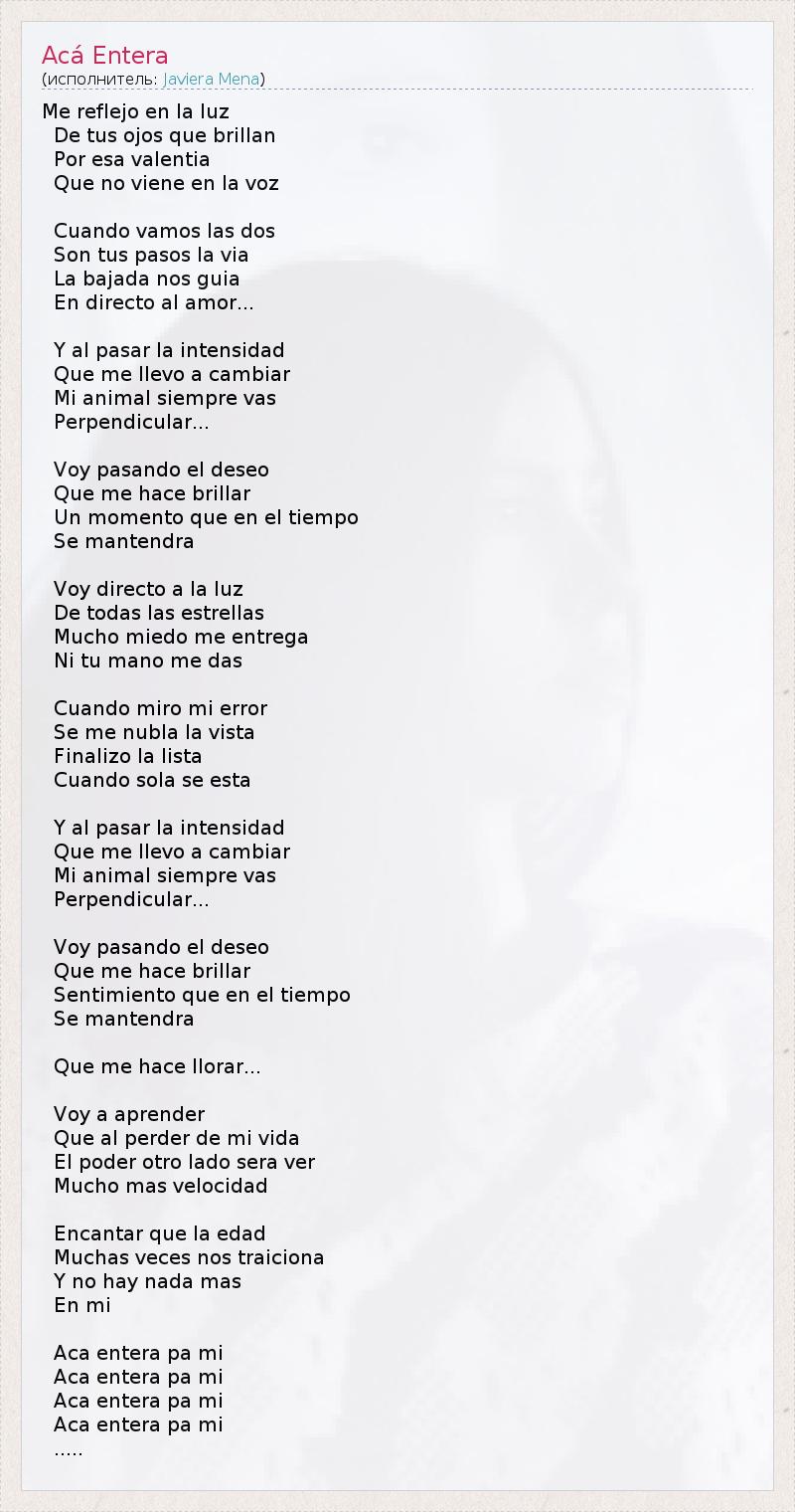 Me reflejo en la luz De tus ojos que brillan Por esa valentia Que no viene en la voz Cuando vamos las dos Son tus pasos la via La bajada nos guia En directo al amor... Y al pasar la intensidad Que me llevo a cambiar Mi animal siempre vas Perpendicular... Voy pasando el deseo Que me hace brillar Un momento que en el tiempo Se mantendra Voy directo a la luz De todas las estrellas Mucho miedo me entrega Ni tu mano me das Cuando miro mi error Se me nubla la vista Finalizo la lista Cuando sola se esta Y al pasar la intensidad Que me llevo a cambiar Mi animal siempre vas Perpendicular... Voy pasando el deseo Que me hace brillar Sentimiento que en el tiempo Se mantendra Que me hace llorar... Voy a aprender Que al perder de mi vida El poder otro lado sera ver Mucho mas velocidad Encantar que la edad Muchas veces nos traiciona Y no hay nada mas En mi Aca entera pa mi Aca entera pa mi Aca entera pa mi Aca entera pa mi .....