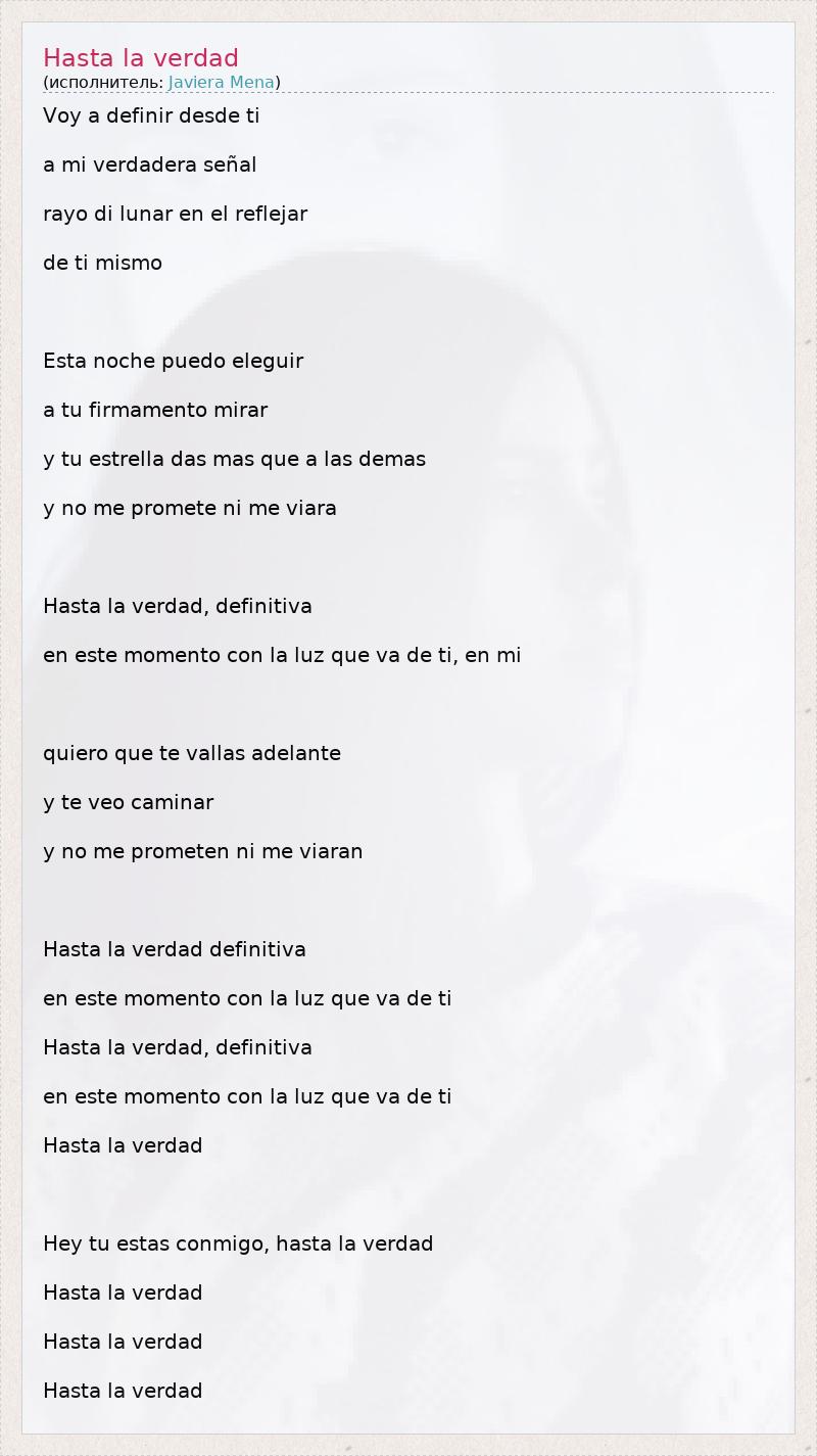 Voy a definir desde ti a mi verdadera señal rayo di lunar en el reflejar de ti mismo Esta noche puedo eleguir a tu firmamento mirar y tu estrella das mas que a las demas y no me promete ni me viara Hasta la verdad, definitiva en este momento con la luz que va de ti, en mi quiero que te vallas adelante y te veo caminar y no me prometen ni me viaran Hasta la verdad definitiva en este momento con la luz que va de ti Hasta la verdad, definitiva en este momento con la luz que va de ti Hasta la verdad Hey tu estas conmigo, hasta la verdad Hasta la verdad Hasta la verdad Hasta la verdad