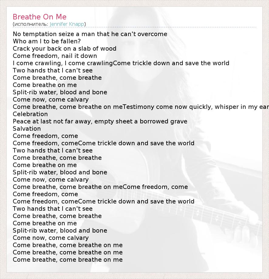 No temptation seize a man that he can't overcome Who am I to be fallen? Crack your back on a slab of wood Come freedom, nail it down I come crawling, I come crawlingCome trickle down and save the world Two hands that I can't see Come breathe, come breathe Come breathe on me Split-rib water, blood and bone Come now, come calvary Come breathe, come breathe on meTestimony come now quickly, whisper in my ear Celebration Peace at last not far away, empty sheet a borrowed grave Salvation Come freedom, come Come freedom, comeCome trickle down and save the world Two hands that I can't see Come breathe, come breathe Come breathe on me Split-rib water, blood and bone Come now, come calvary Come breathe, come breathe on meCome freedom, come Come freedom, come Come freedom, comeCome trickle down and save the world Two hands that I can't see Come breathe, come breathe Come breathe on me Split-rib water, blood and bone Come now, come calvary Come breathe, come breathe on me Come breathe, come breathe on me Come breathe, come breathe on me