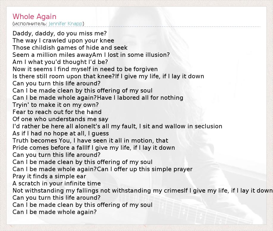 Daddy, daddy, do you miss me? The way I crawled upon your knee Those childish games of hide and seek Seem a million miles awayAm I lost in some illusion? Am I what you'd thought I'd be? Now it seems I find myself in need to be forgiven Is there still room upon that knee?If I give my life, if I lay it down Can you turn this life around? Can I be made clean by this offering of my soul Can I be made whole again?Have I labored all for nothing Tryin' to make it on my own? Fear to reach out for the hand Of one who understands me say I'd rather be here all aloneIt's all my fault, I sit and wallow in seclusion As if I had no hope at all, I guess Truth becomes You, I have seen it all in motion, that Pride comes before a fallIf I give my life, if I lay it down Can you turn this life around? Can I be made clean by this offering of my soul Can I be made whole again?Can I offer up this simple prayer Pray it finds a simple ear A scratch in your infinite time Not withstanding my fallings not withstanding my crimesIf I give my life, if I lay it down Can you turn this life around? Can I be made clean by this offering of my soul Can I be made whole again?