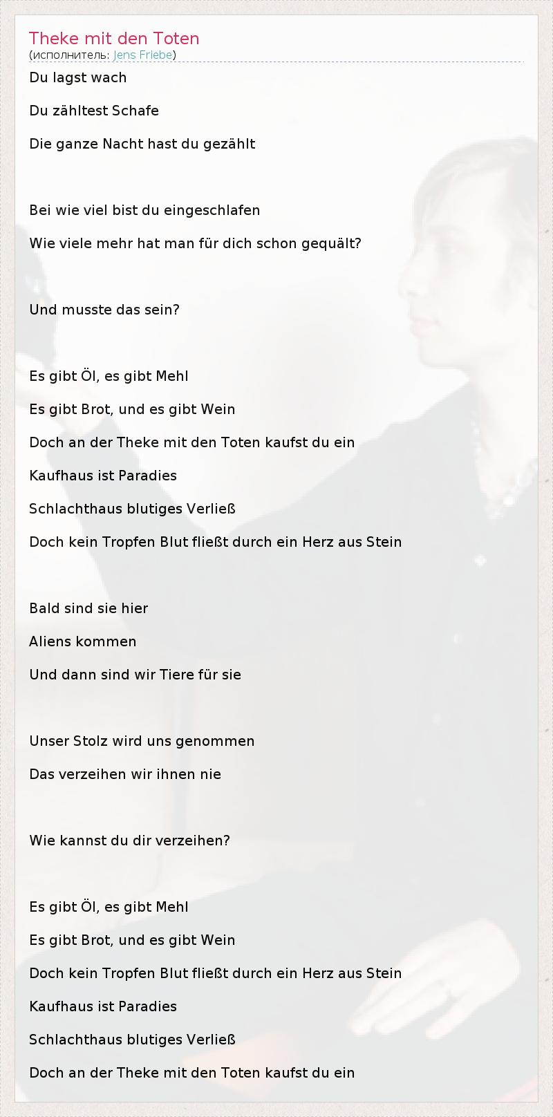 Du lagst wach Du zähltest Schafe Die ganze Nacht hast du gezählt Bei wie viel bist du eingeschlafen Wie viele mehr hat man für dich schon gequält? Und musste das sein? Es gibt Öl, es gibt Mehl Es gibt Brot, und es gibt Wein Doch an der Theke mit den Toten kaufst du ein Kaufhaus ist Paradies Schlachthaus blutiges Verließ Doch kein Tropfen Blut fließt durch ein Herz aus Stein Bald sind sie hier Aliens kommen Und dann sind wir Tiere für sie Unser Stolz wird uns genommen Das verzeihen wir ihnen nie Wie kannst du dir verzeihen? Es gibt Öl, es gibt Mehl Es gibt Brot, und es gibt Wein Doch kein Tropfen Blut fließt durch ein Herz aus Stein Kaufhaus ist Paradies Schlachthaus blutiges Verließ Doch an der Theke mit den Toten kaufst du ein