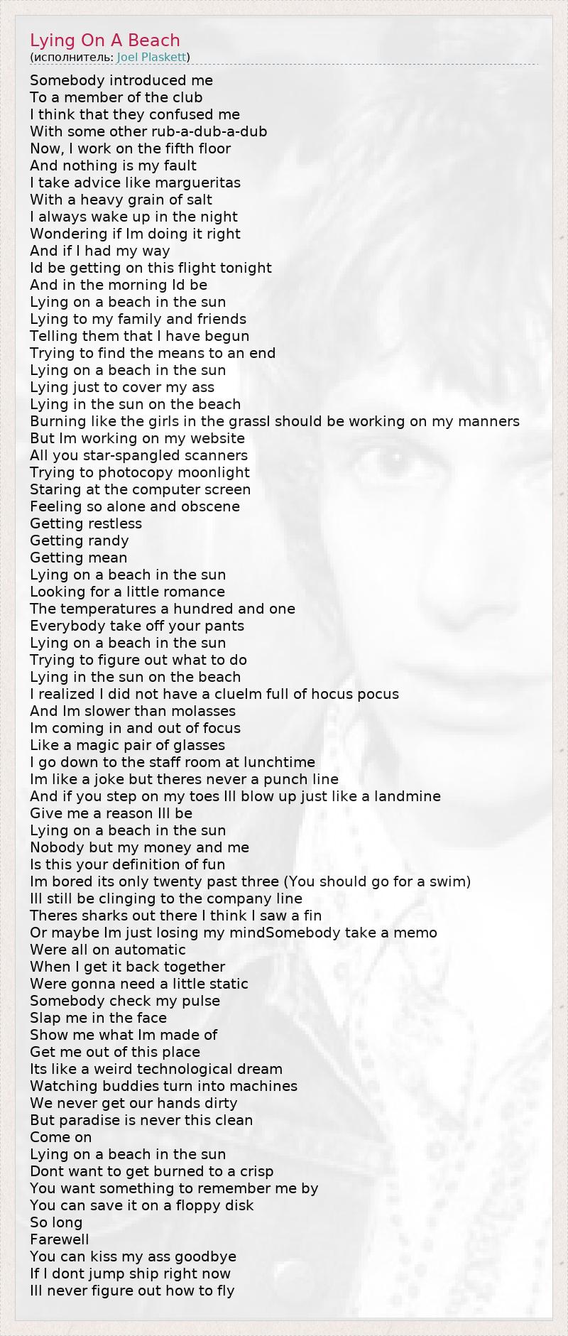 Somebody introduced me To a member of the club I think that they confused me With some other rub-a-dub-a-dub Now, I work on the fifth floor And nothing is my fault I take advice like margueritas With a heavy grain of salt I always wake up in the night Wondering if Im doing it right And if I had my way Id be getting on this flight tonight And in the morning Id be Lying on a beach in the sun Lying to my family and friends Telling them that I have begun Trying to find the means to an end Lying on a beach in the sun Lying just to cover my ass Lying in the sun on the beach Burning like the girls in the grassI should be working on my manners But Im working on my website All you star-spangled scanners Trying to photocopy moonlight Staring at the computer screen Feeling so alone and obscene Getting restless Getting randy Getting mean Lying on a beach in the sun Looking for a little romance The temperatures a hundred and one Everybody take off your pants Lying on a beach in the sun Trying to figure out what to do Lying in the sun on the beach I realized I did not have a clueIm full of hocus pocus And Im slower than molasses Im coming in and out of focus Like a magic pair of glasses I go down to the staff room at lunchtime Im like a joke but theres never a punch line And if you step on my toes Ill blow up just like a landmine Give me a reason Ill be Lying on a beach in the sun Nobody but my money and me Is this your definition of fun Im bored its only twenty past three (You should go for a swim) Ill still be clinging to the company line Theres sharks out there I think I saw a fin Or maybe Im just losing my mindSomebody take a memo Were all on automatic When I get it back together Were gonna need a little static Somebody check my pulse Slap me in the face Show me what Im made of Get me out of this place Its like a weird technological dream Watching buddies turn into machines We never get our hands dirty But paradise is never this clean Come on Lying on a beach in the sun Dont want to get burned to a crisp You want something to remember me by You can save it on a floppy disk So long Farewell You can kiss my ass goodbye If I dont jump ship right now Ill never figure out how to fly