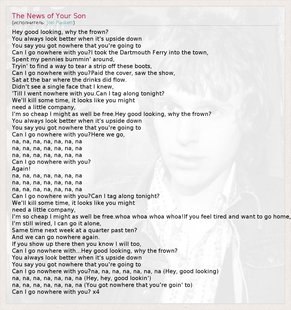 Hey good looking, why the frown? You always look better when it's upside down You say you got nowhere that you're going to Can I go nowhere with you?I took the Dartmouth Ferry into the town, Spent my pennies bummin' around, Tryin' to find a way to tear a strip off these boots, Can I go nowhere with you?Paid the cover, saw the show, Sat at the bar where the drinks did flow. Didn't see a single face that I knew, 'Till I went nowhere with you.Can I tag along tonight? We'll kill some time, it looks like you might need a little company, I'm so cheap I might as well be free.Hey good looking, why the frown? You always look better when it's upside down You say you got nowhere that you're going to Can I go nowhere with you?Here we go, na, na, na, na, na, na, na na, na, na, na, na, na, na na, na, na, na, na, na, na Can I go nowhere with you? Again! na, na, na, na, na, na, na na, na, na, na, na, na, na na, na, na, na, na, na, na Can I go nowhere with you?Can I tag along tonight? We'll kill some time, it looks like you might need a little company, I'm so cheap I might as well be free.whoa whoa whoa whoa!If you feel tired and want to go home, I'm still wired, I can go it alone, Same time next week at a quarter past ten? And we can go nowhere again. If you show up there then you know I will too, Can I go nowhere with...Hey good looking, why the frown? You always look better when it's upside down You say you got nowhere that you're going to Can I go nowhere with you?na, na, na, na, na, na, na (Hey, good looking) na, na, na, na, na, na, na (Hey, hey, good lookin') na, na, na, na, na, na, na (You got nowhere that you're goin' to) Can I go nowhere with you? x4