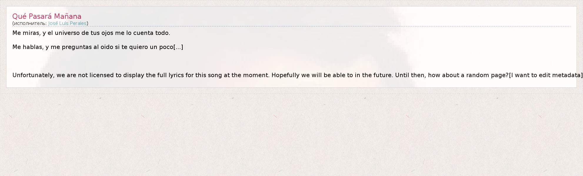 Me miras, y el universo de tus ojos me lo cuenta todo. Me hablas, y me preguntas al oido si te quiero un poco[...] Unfortunately, we are not licensed to display the full lyrics for this song at the moment. Hopefully we will be able to in the future. Until then, how about a random page?[I want to edit metadata]